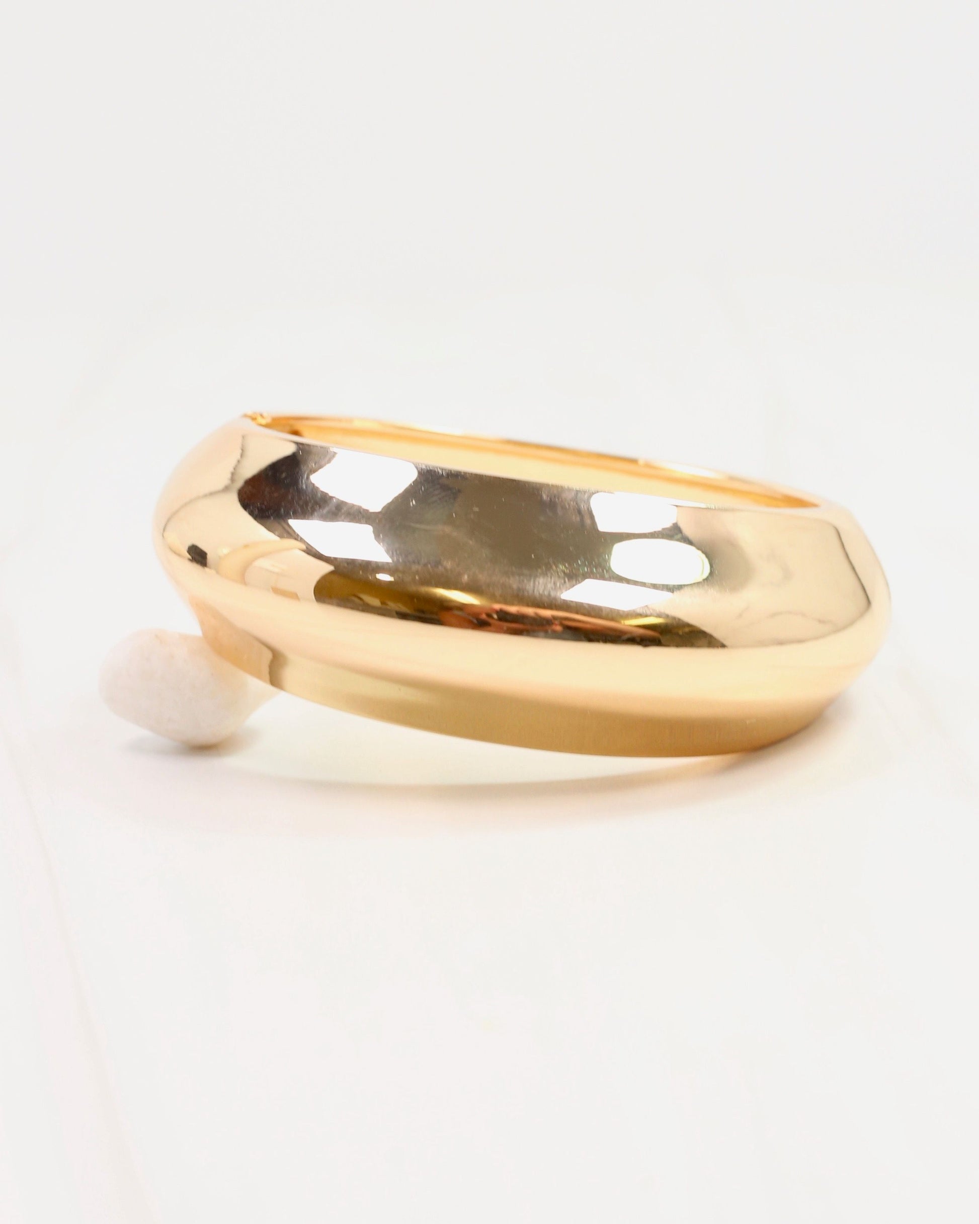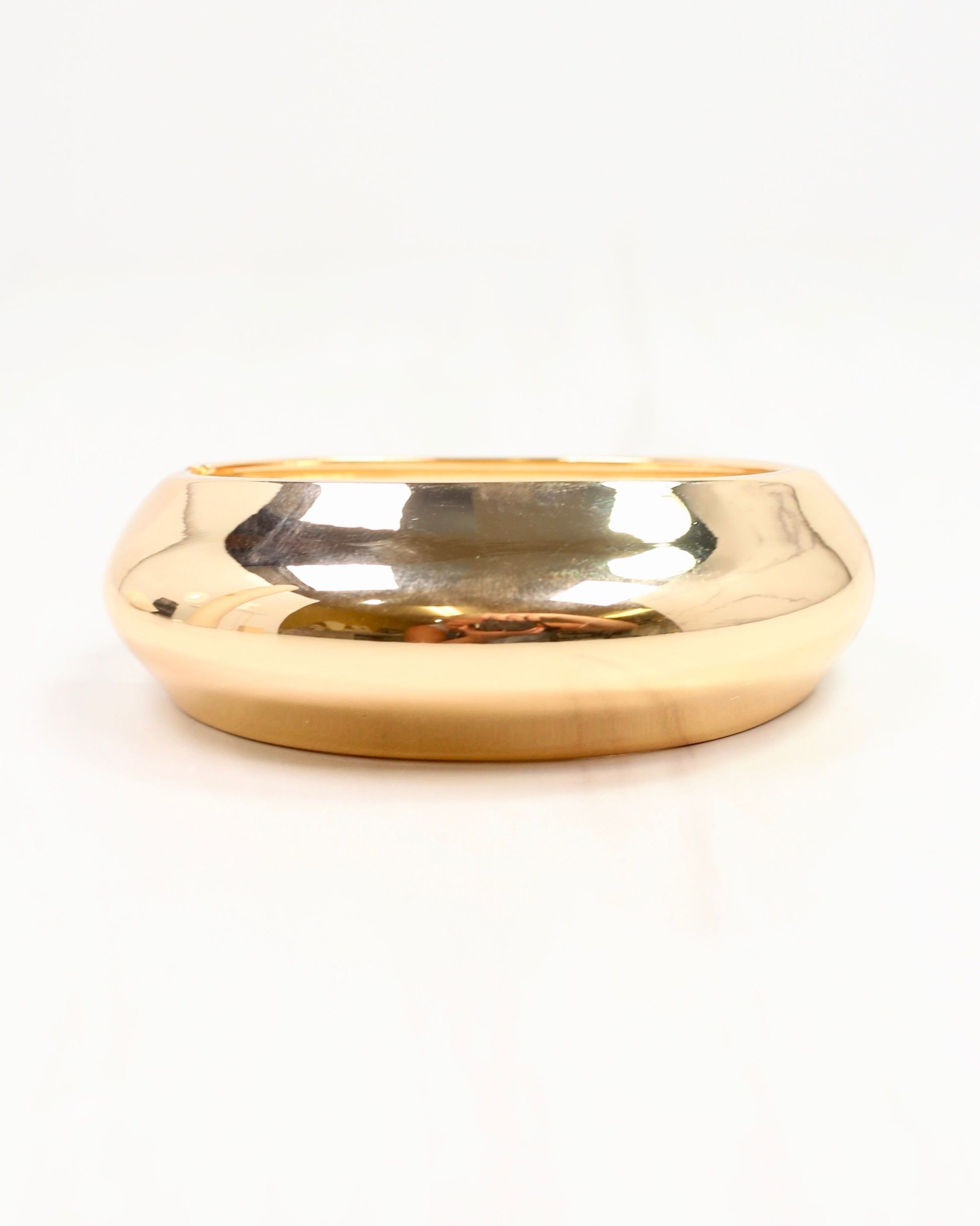 Elevate your style with the Addington Bangle Gold—a shiny, hinged dome bracelet that curves with dramatic flair. Perfect for layering or wearing solo, this playful piece adds a touch of classy chic to any outfit. Shine bright and turn heads wherever you go!