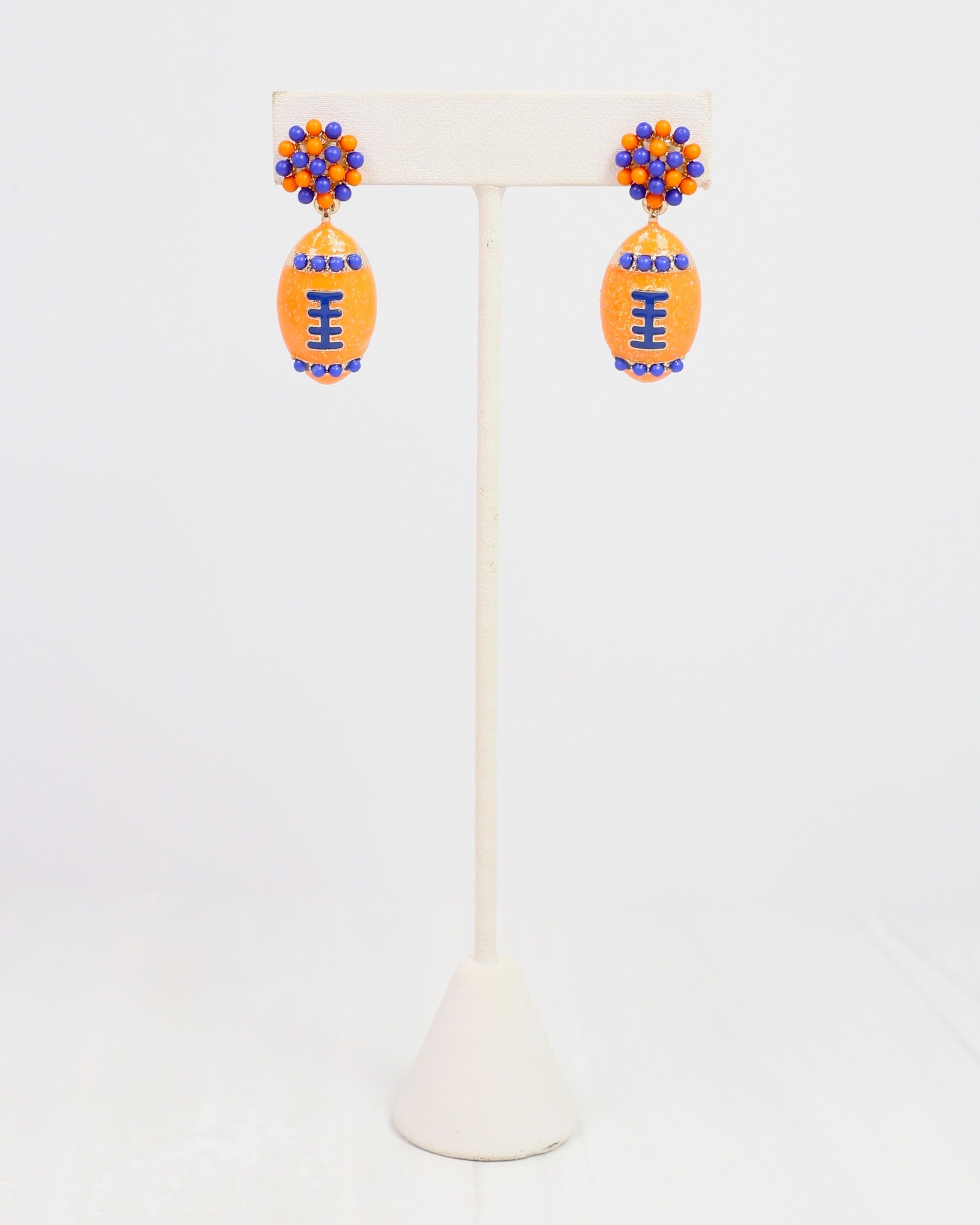 Show your team spirit with the Adler Football Earring in Orange and Blue. This playful stud features a glittery enamel football accented with detailed laces and seed bead embellishments. Perfect for Friday night games or adding a sporty touch to any outfit, these earrings bring fun and flair to your game day look.