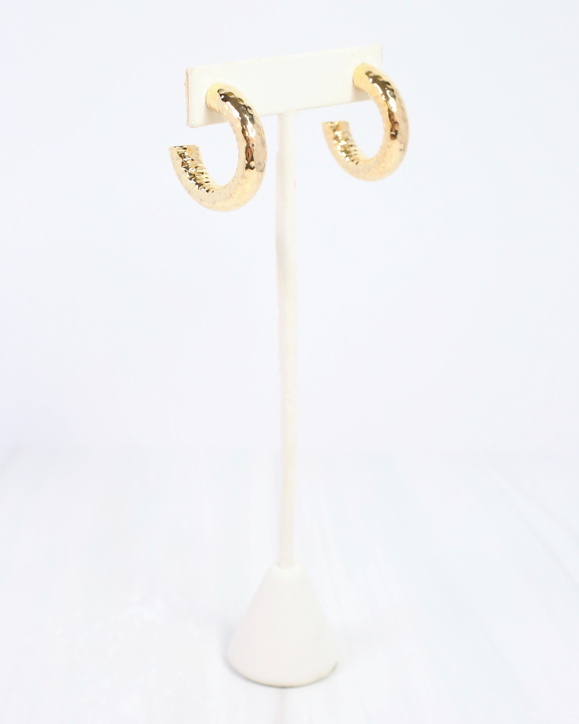 Elevate your everyday style with the Agatha Hoop Earring in Gold. Crafted from gold-dipped brass, this hammered shiny hoop offers a subtle texture that catches the light beautifully. Its classic yet modern design makes it an essential accessory for effortless daily wear, adding a polished finish to any outfit.