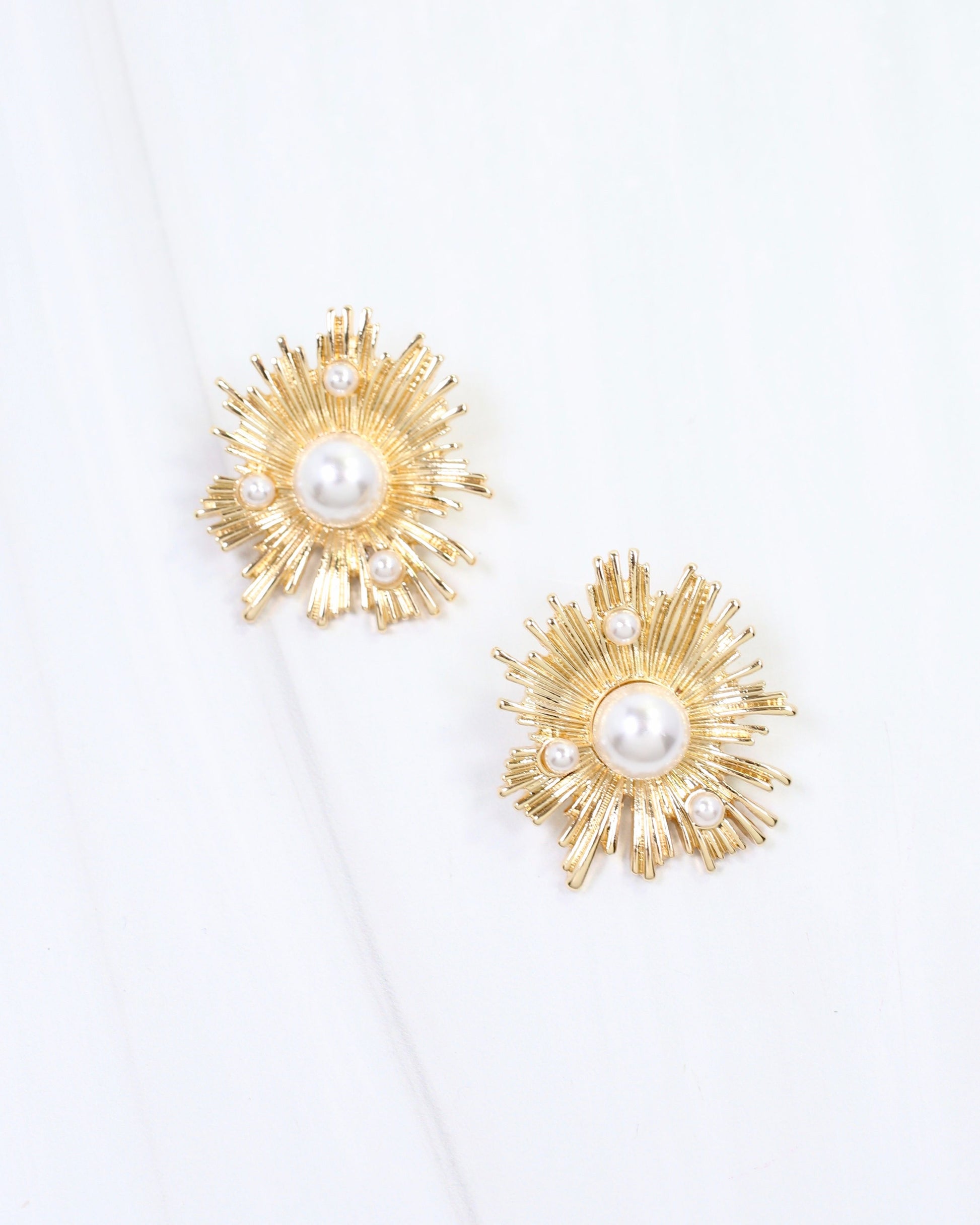 Elegant pearl sunburst earrings crafted in lustrous gold. Each piece features a radiant design with a lustrous pearl center, creating a timeless look that transitions seamlessly from day to evening wear. The sunburst motif adds dimension and visual interest, while the gold finish provides warmth and sophistication. Perfect for adding a touch of refined glamour to any outfit.