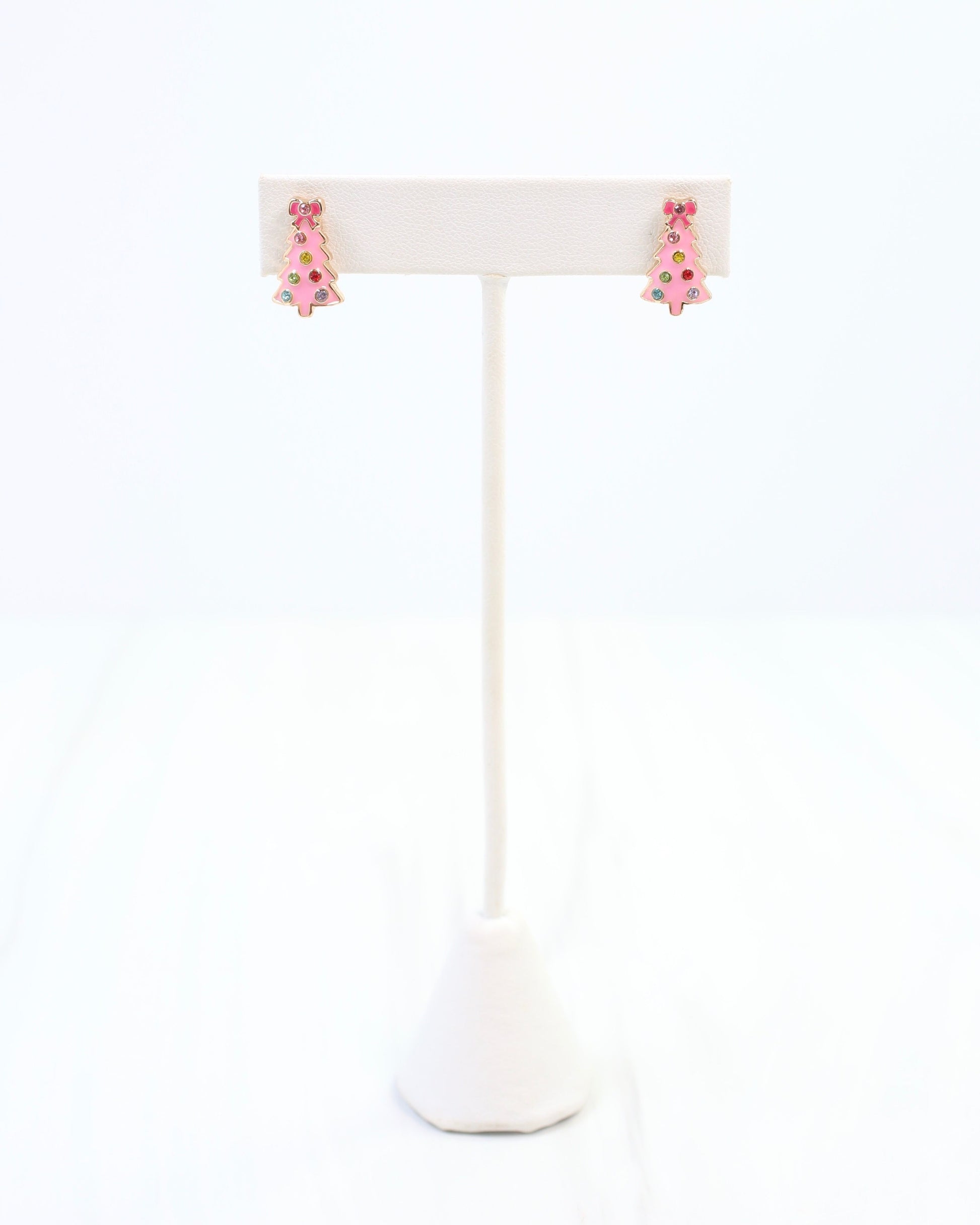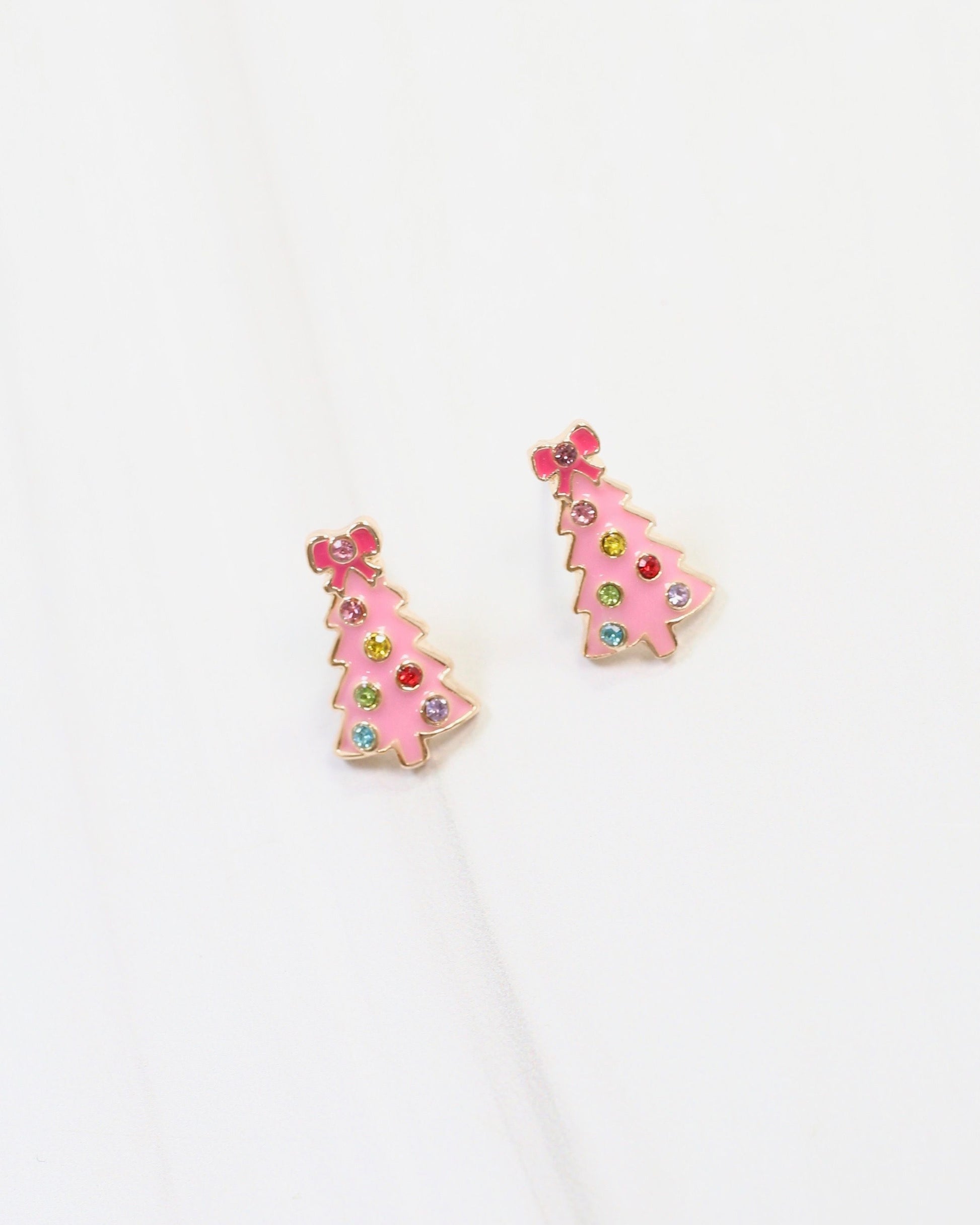 Add a festive touch to any outfit with the All is Calm Christmas Tree Stud in Pink. This petite pink enamel tree features sparkling multicolor crystal ornaments and a charming pink bow, creating a fashionable and delicate holiday accessory that effortlessly captures seasonal spirit.