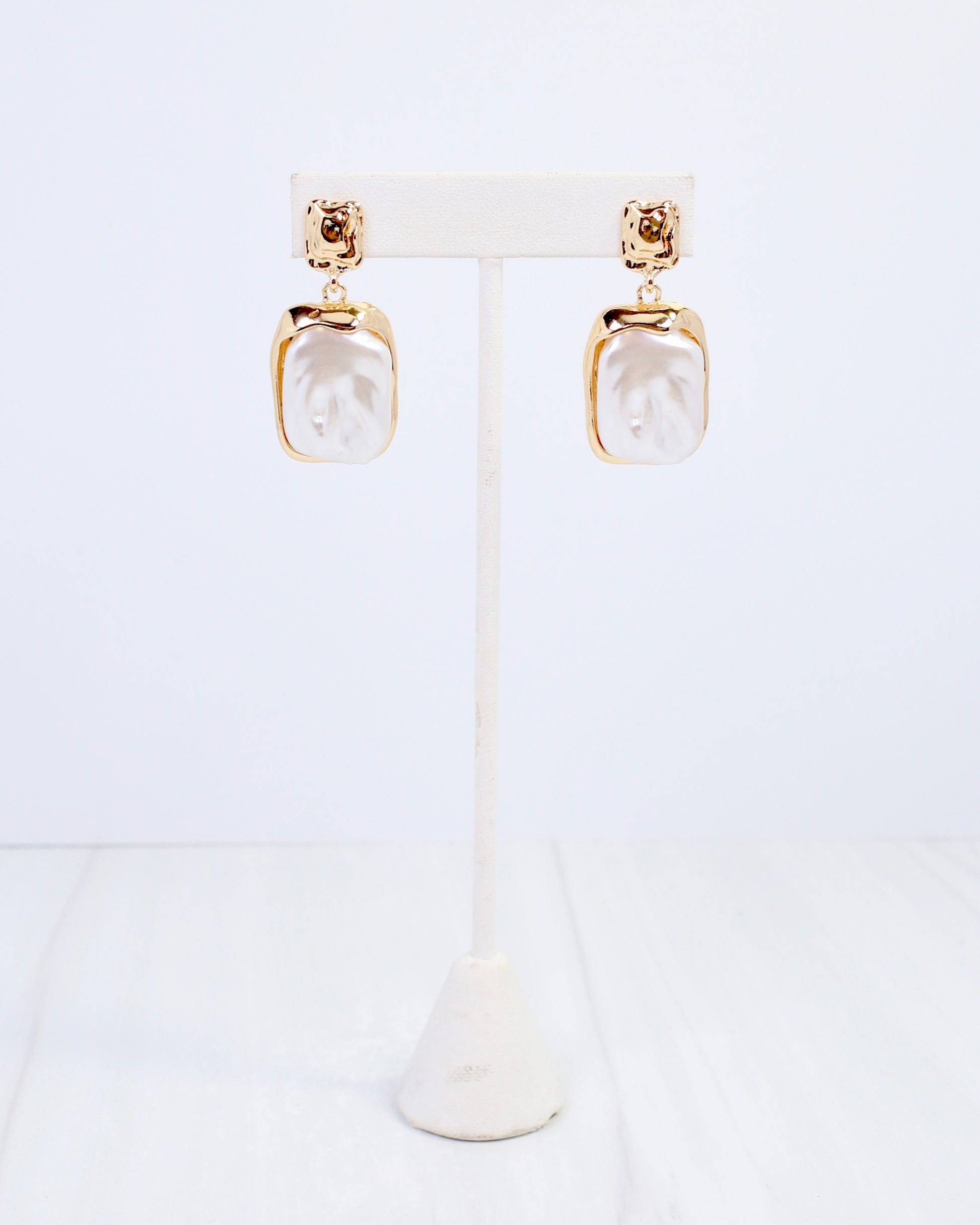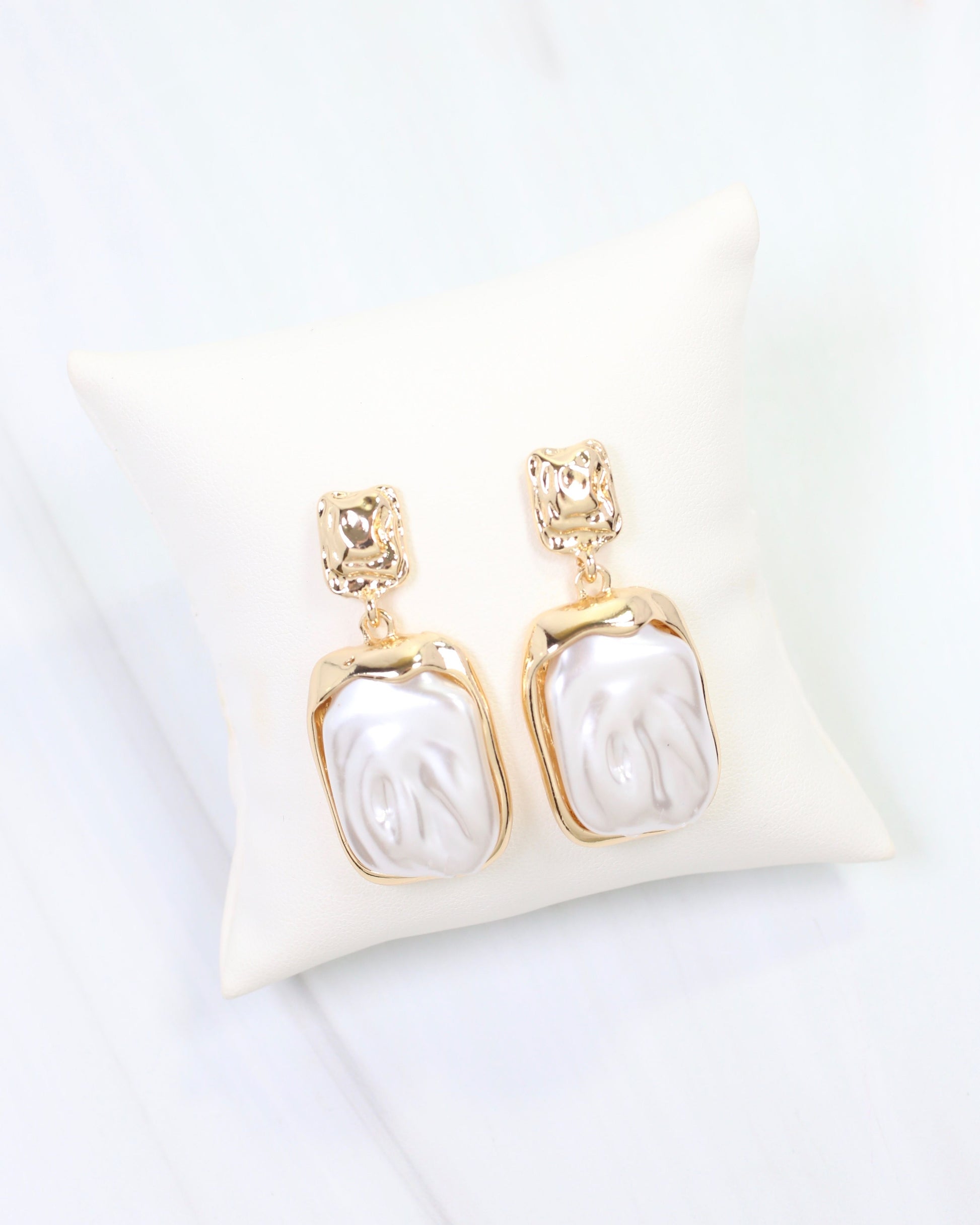 Elegant geometric pearl drop earrings in lustrous gold. Modern angular design meets timeless pearl accents for refined glamour. Lightweight and comfortable for everyday wear or special occasions. Gold finish complements all skin tones.