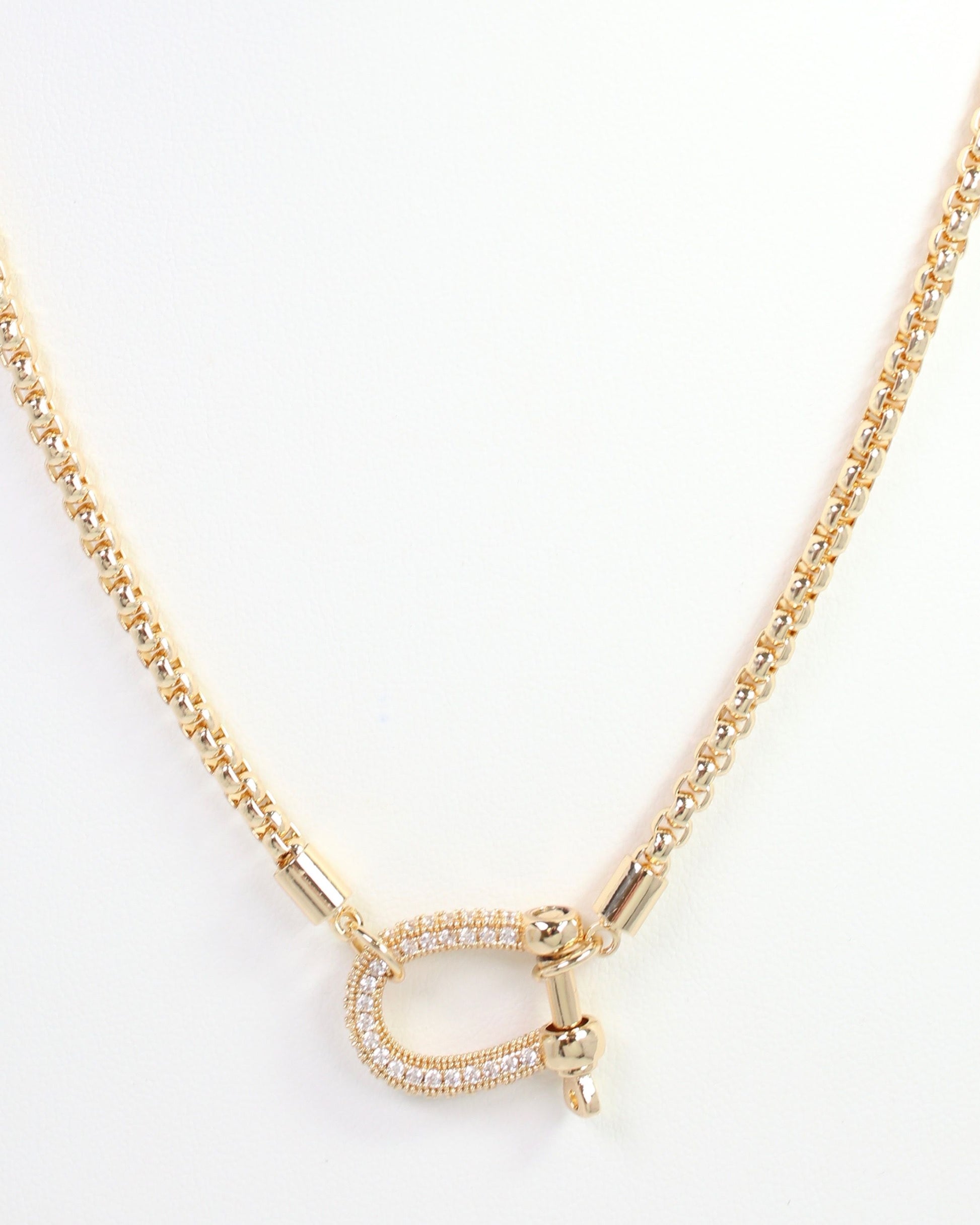 Add a touch of luxury to your look with the Amana Horsebit CZ Pave Necklace in Gold. Featuring a stylish horsebit design embellished with sparkling CZ pave accents, this necklace offers a sophisticated and fashionable statement piece that effortlessly elevates any outfit.