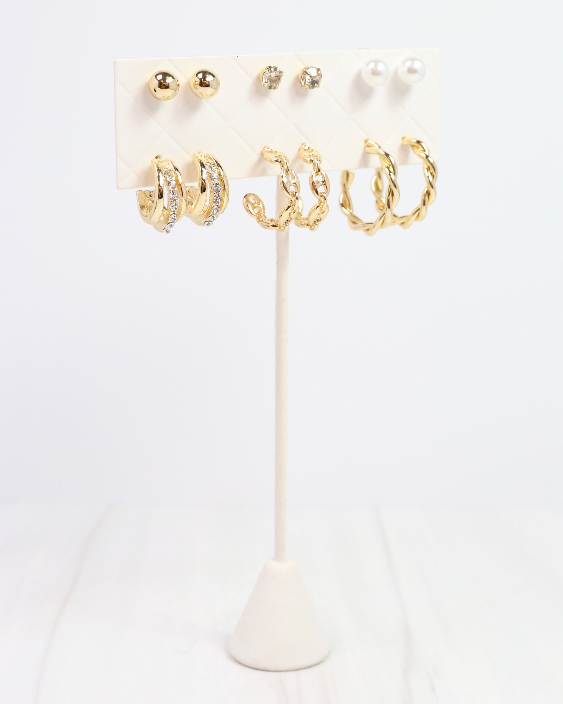 Add a touch of sparkle and charm to your everyday look with the Amanda Hoop Earring Set in Gold! This playful collection features six pairs of earrings, including gleaming gold hoops, delicate pearl studs, and dazzling CZ accents. Mix and match the CZ/gold hoops, link hoops, and twisted gold hoops to create endless fun combinations that brighten any outfit.