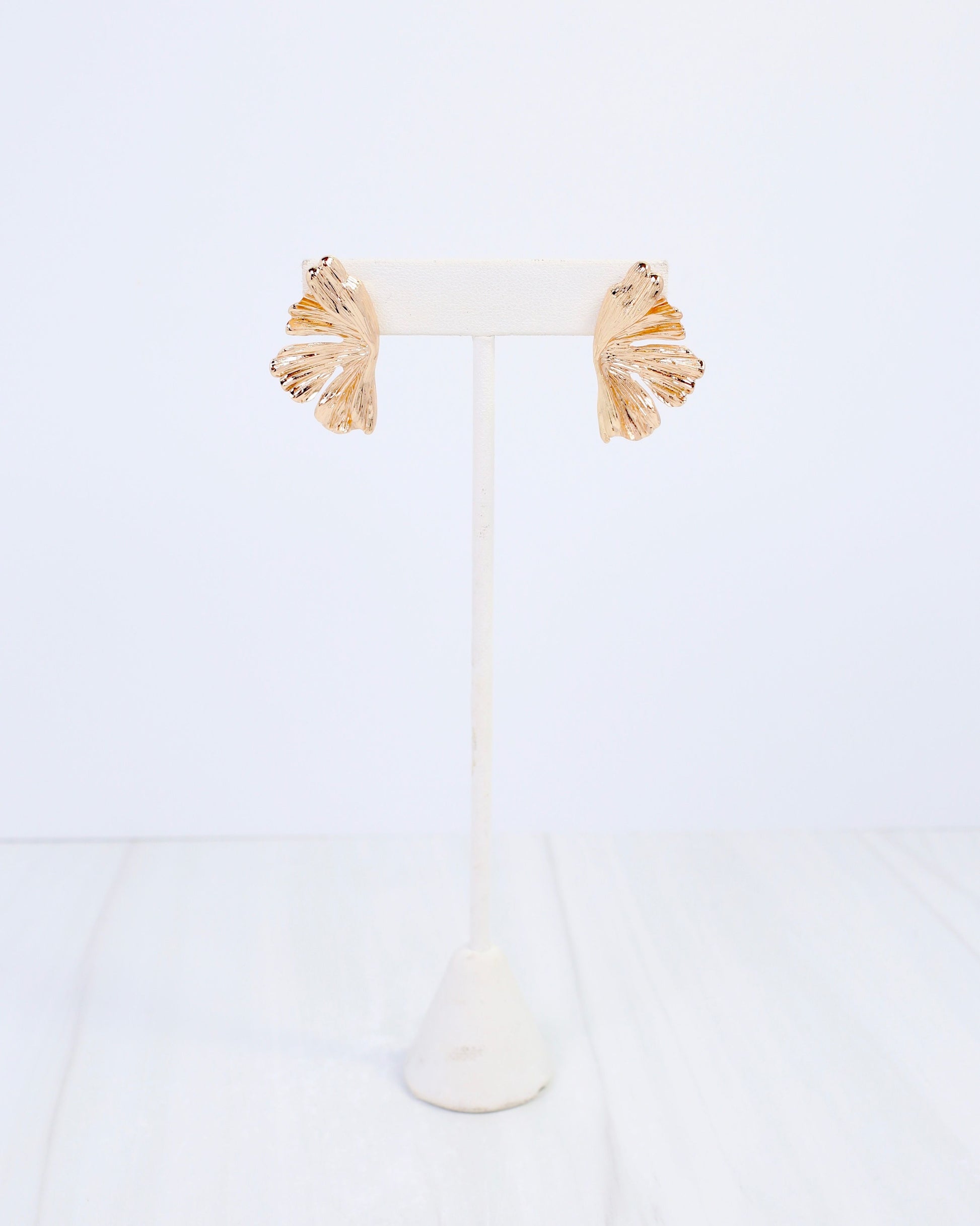 Elegant gold leaf-shaped post earrings with delicate fan design. Lightweight and comfortable for everyday wear or special occasions. Timeless botanical style that complements any look.