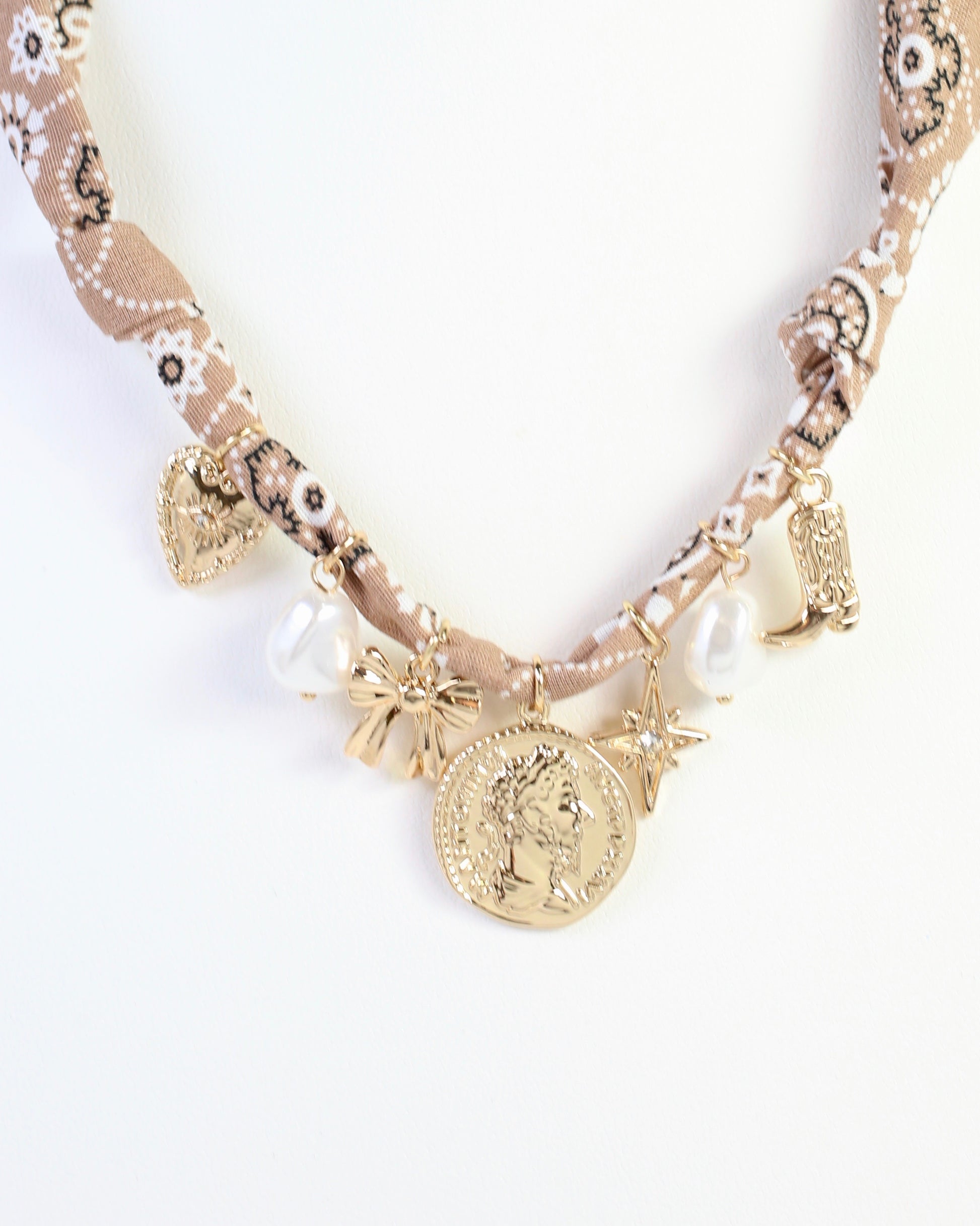 Get a playful western twist with the Amy Scarf Charm Necklace in Khaki. This bandana-style scarf is knotted and features seven charming accents—boot, coin, pearls, star, bow, and heart—creating a sweet and stylish way to embrace that western vibe with a fun flair.
