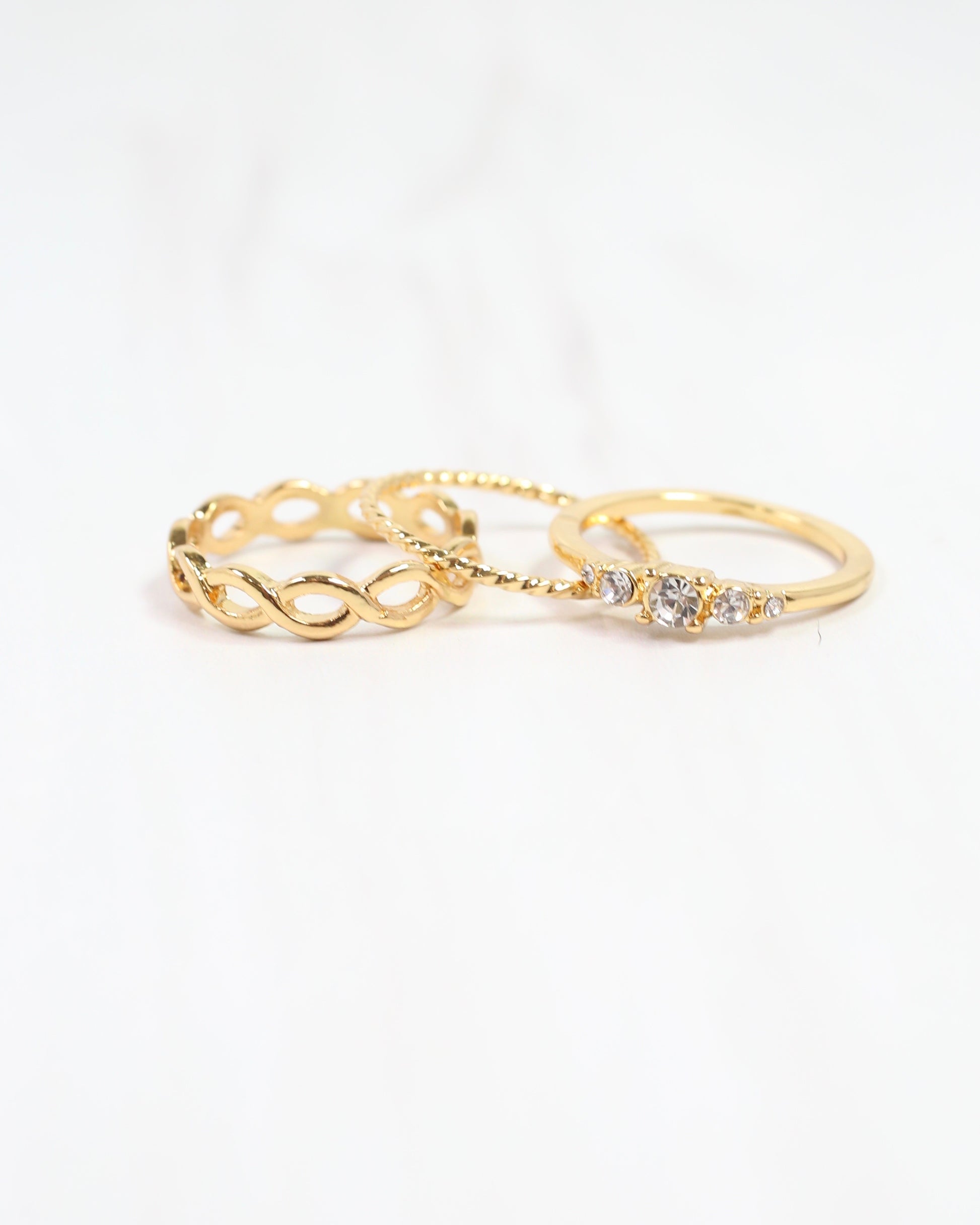 Brighten up your stack with the Arwen Ring Set Gold! This playful trio features a twisted link ring, a sparkling cz cluster on a gold band, and a textured band. Perfect for mixing, matching, and adding a fun touch of sparkle to any outfit.