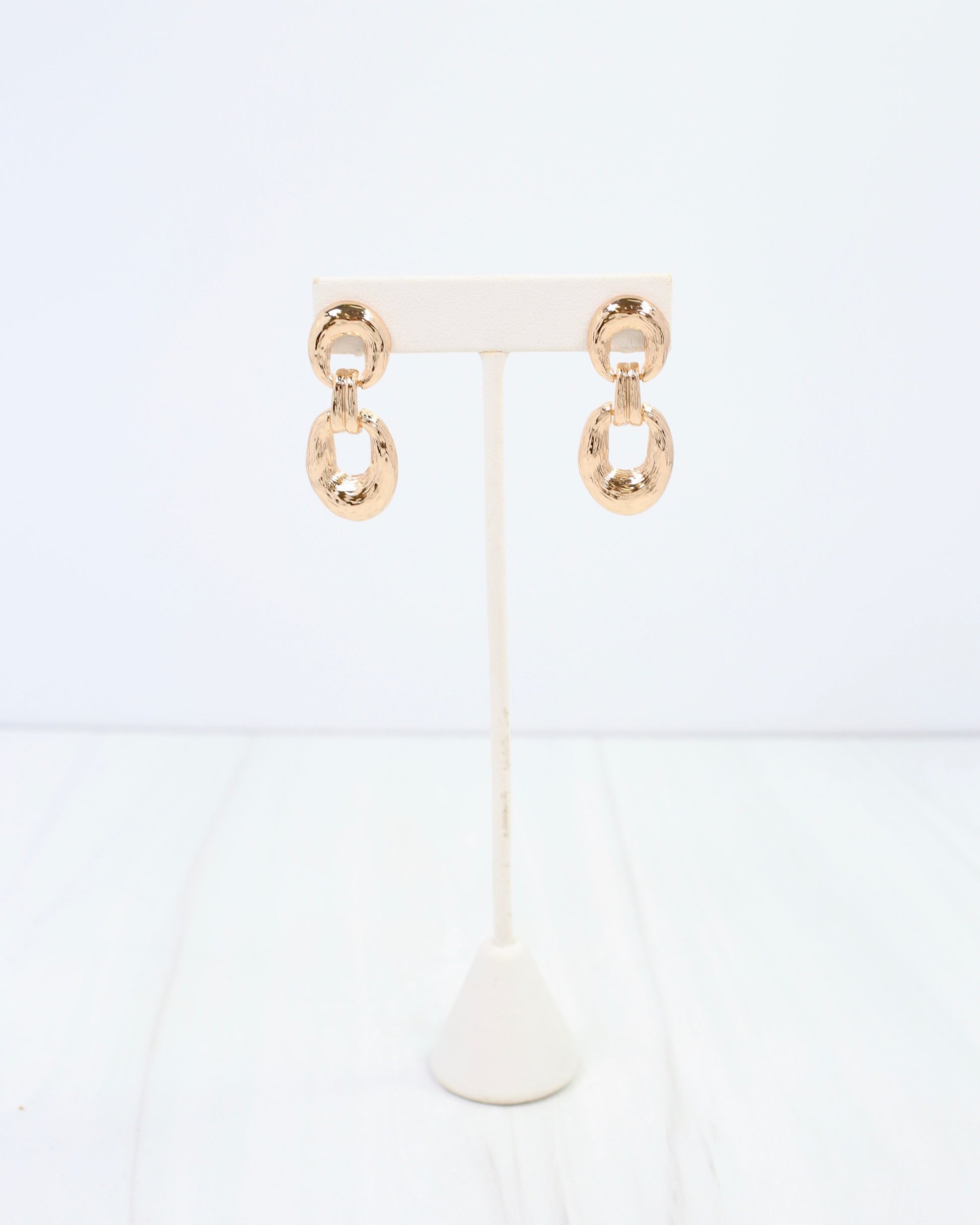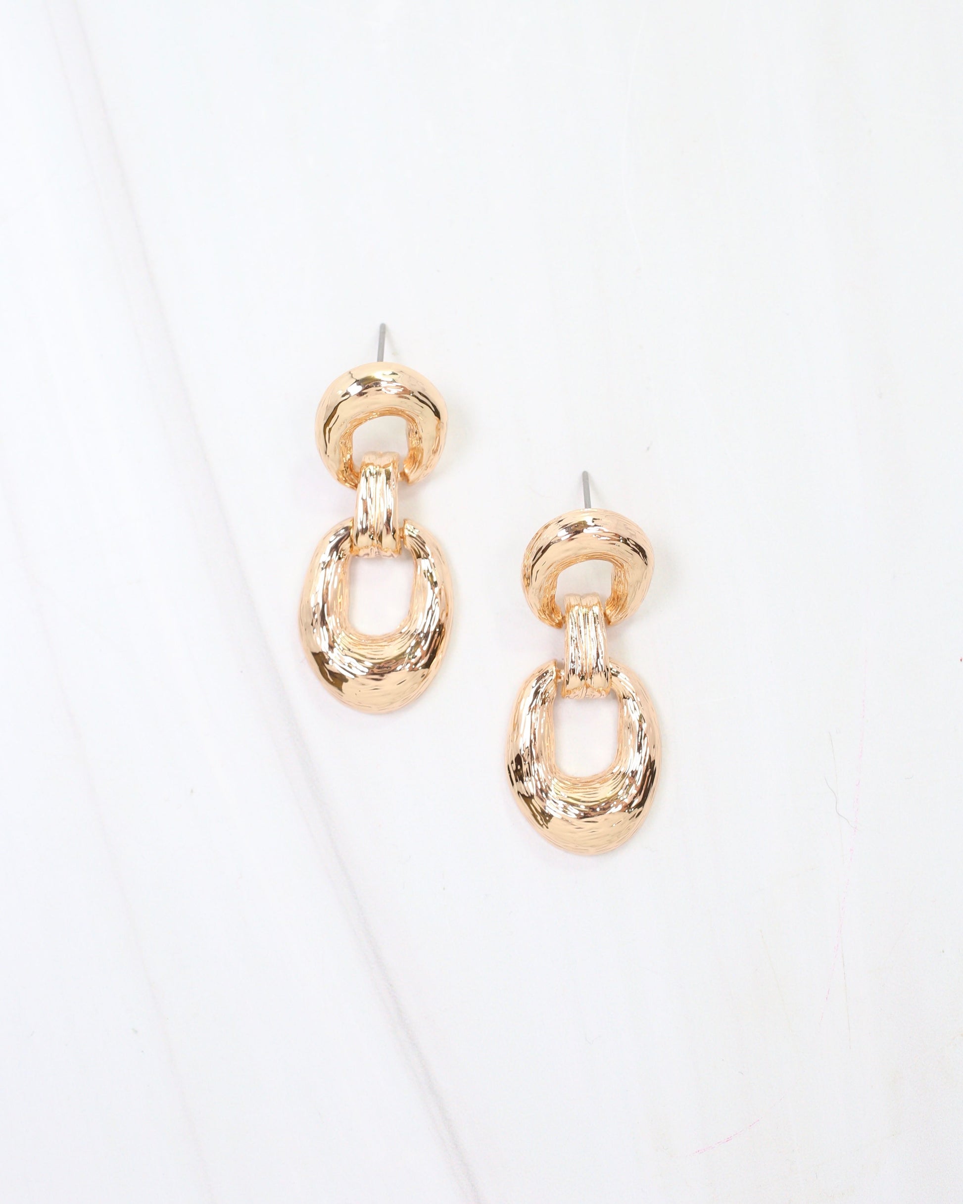 Add a touch of bold elegance with the Bardstown Textured Drop Earrings in Gold. Featuring double hinged links that create playful movement, these dangle earrings bring dynamic texture and shine to any outfit. Perfect for making a stylish statement from day to night, their secure post fastening ensures comfortable wear with a fashionable edge.