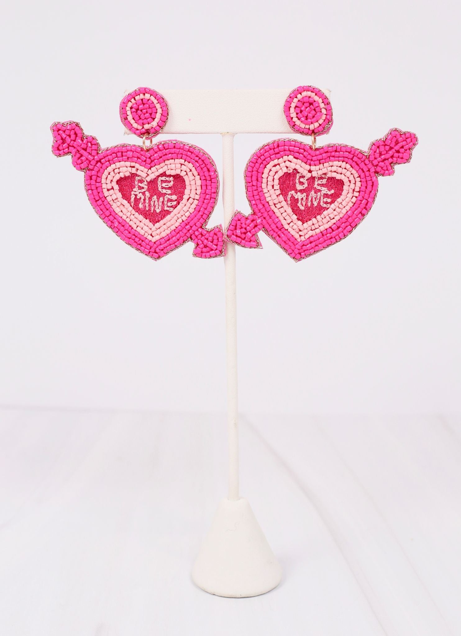 This heart shaped beaded earring is two toned with "Be Mine" embroidered in the middle. It has a beaded arrow and beaded post as well.