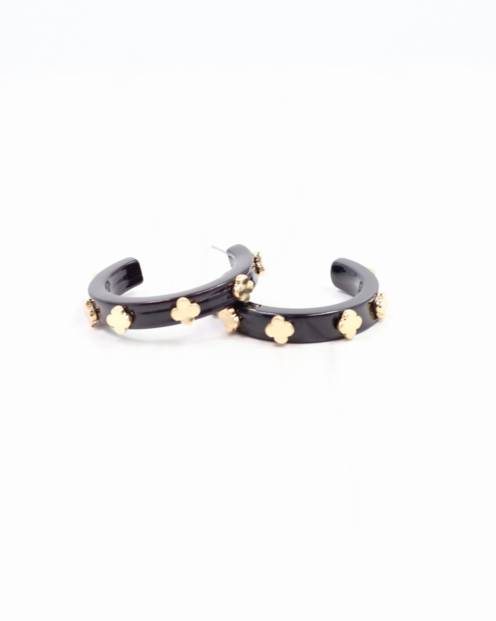 Add a playful touch to your look with these Bellamy Clover Hoop Earrings in black. Featuring charming gold clovers set against warm fall tones, these soft statement hoops bring a fun and festive vibe to any outfit. Perfect for those who love a little whimsy with their style!