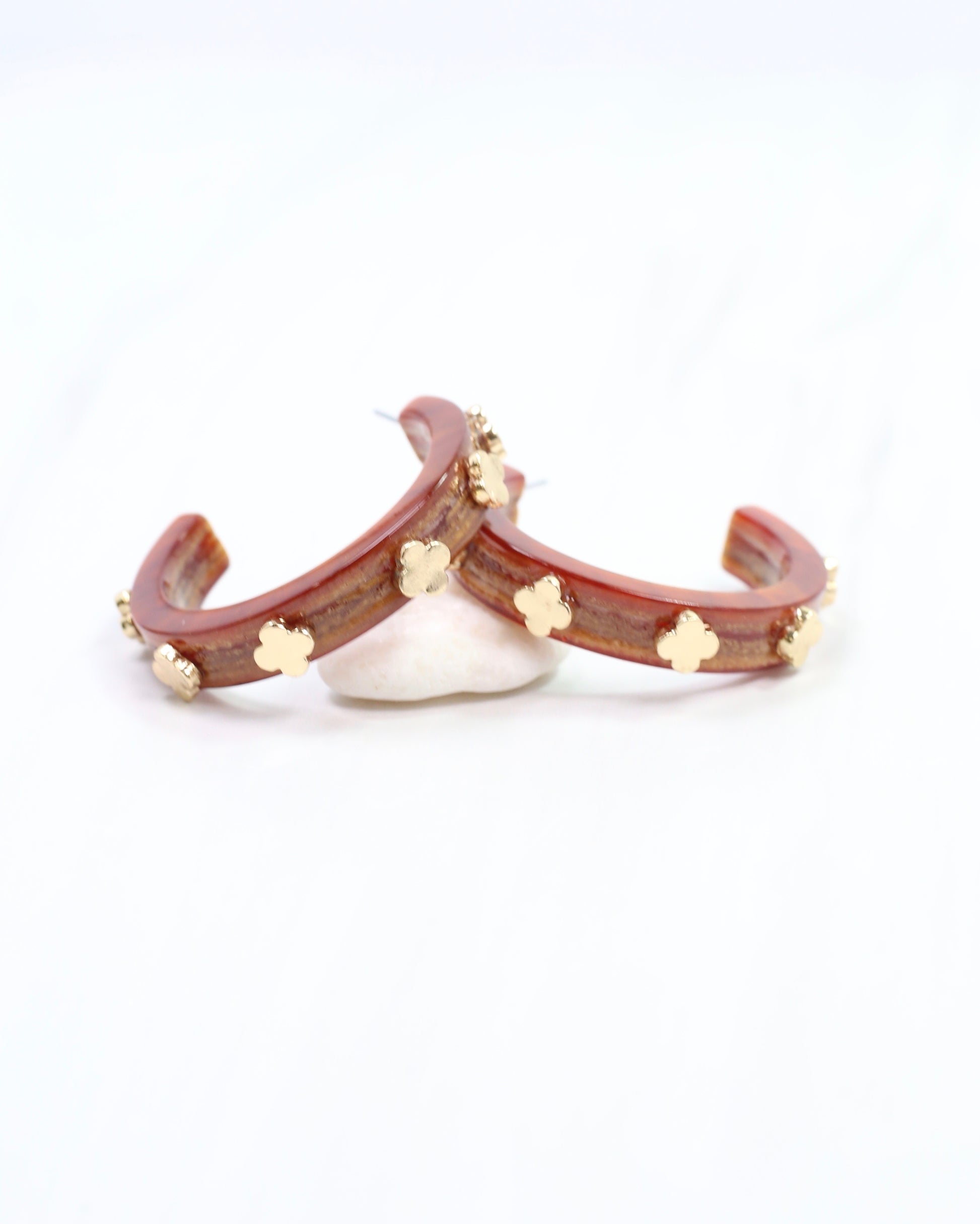 Add a playful touch to your look with these Bellamy Clover Hoop Earrings in natural tortoise. Featuring charming gold clovers set against warm fall tones, these soft statement hoops bring a fun and festive vibe to any outfit. Perfect for those who love a little whimsy with their style!