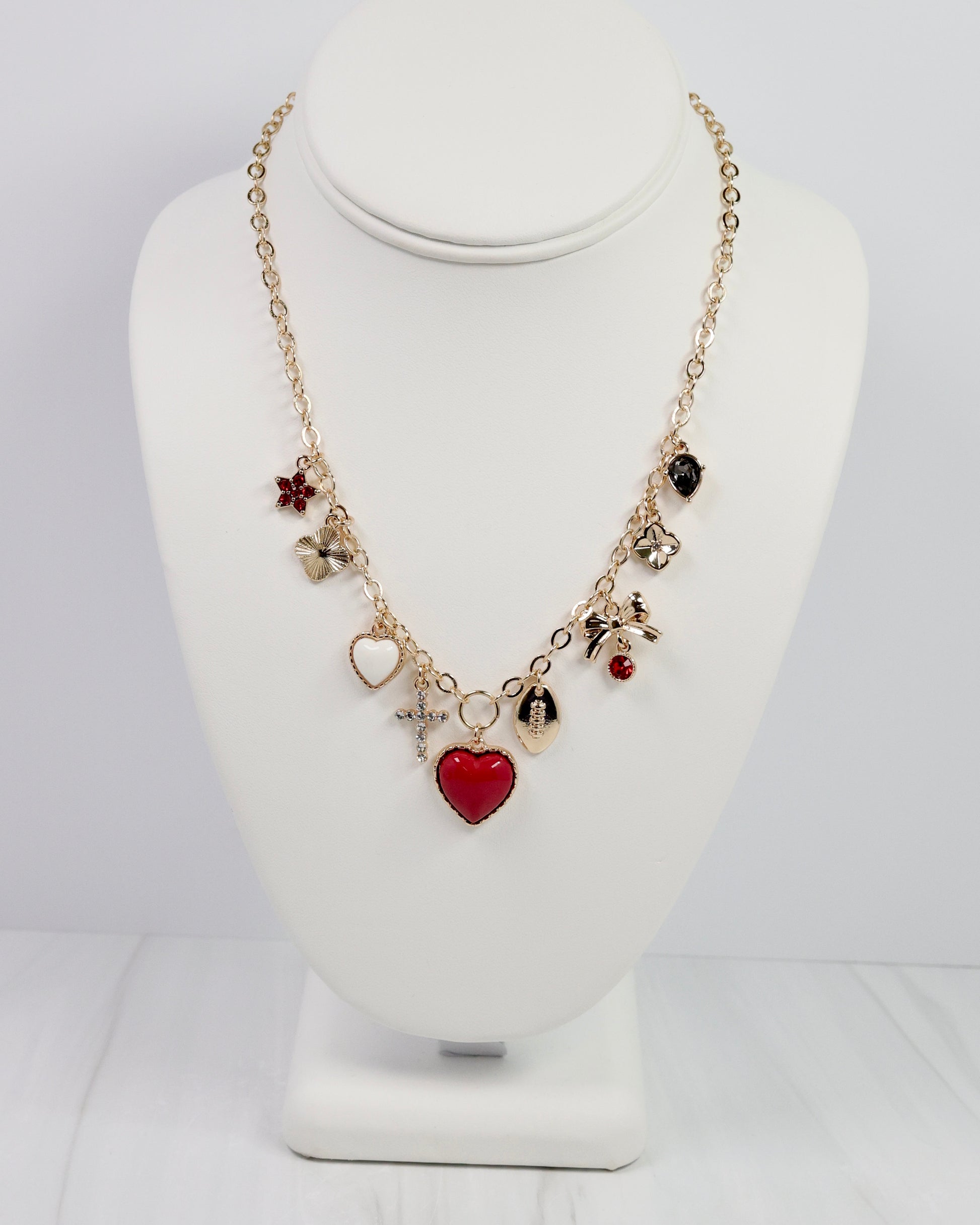 Celebrate game day in style with the Bentley Charm Necklace in crimson and white. It also in includes a small gray cz charm. This fashionable piece features two heart charms in your team colors, a football charm, and a variety of other playful accents. Perfect for showing your spirit with a chic touch, it’s a must-have accessory for every fan looking to combine passion and trend effortlessly.