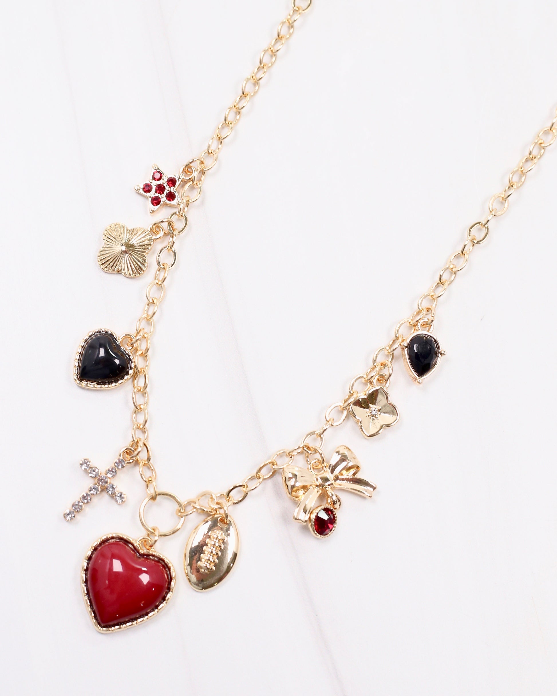 Celebrate game day in style with the Bentley Charm Necklace in garnet and black. This fashionable piece features two heart charms in your team colors, a football charm, and a variety of other playful accents. Perfect for showing your spirit with a chic touch, it’s a must-have accessory for every fan looking to combine passion and trend effortlessly.