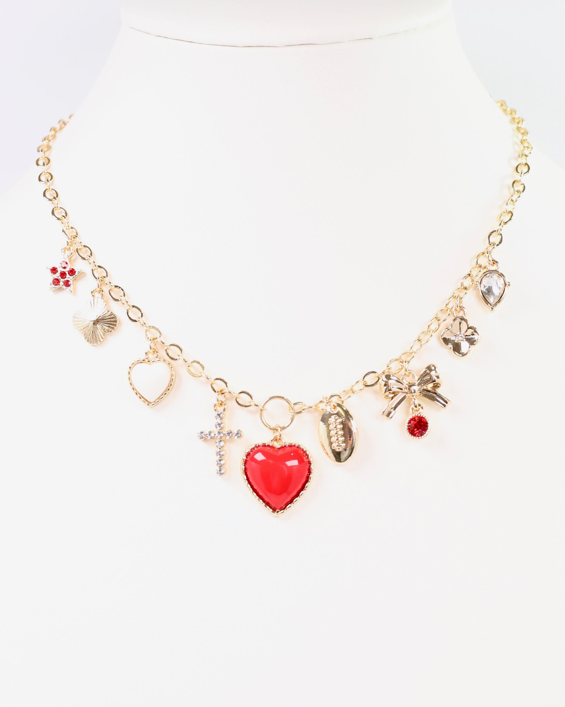 Celebrate game day in style with the Bentley Charm Necklace in red and white. This fashionable piece features two heart charms in your team colors, a football charm, and a variety of other playful accents. Perfect for showing your spirit with a chic touch, it’s a must-have accessory for every fan looking to combine passion and trend effortlessly.