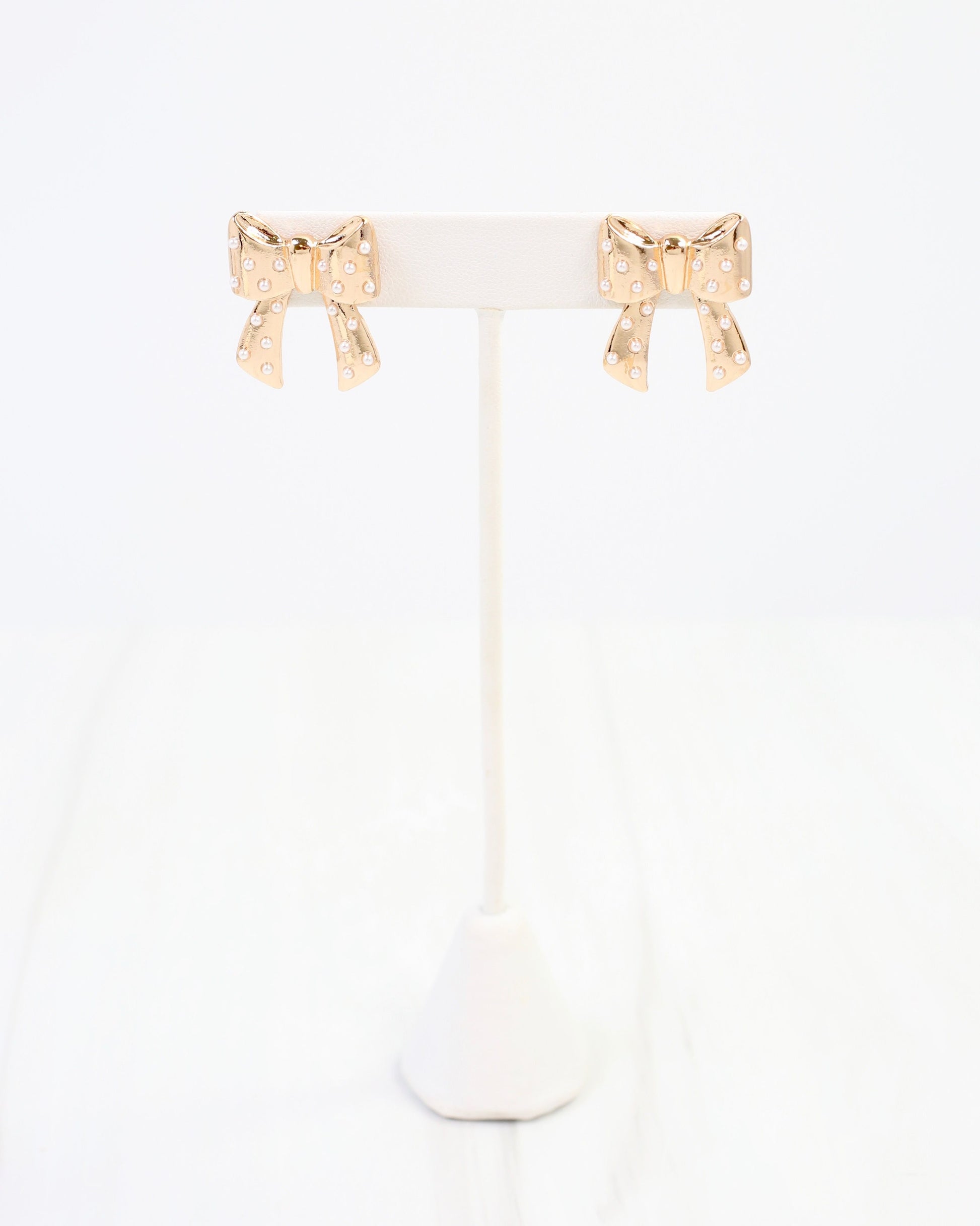 The Bethlehem Bow Stud in Gold features a shiny gold bow stud with petite pearl accents, perfect for a stylish holiday look.