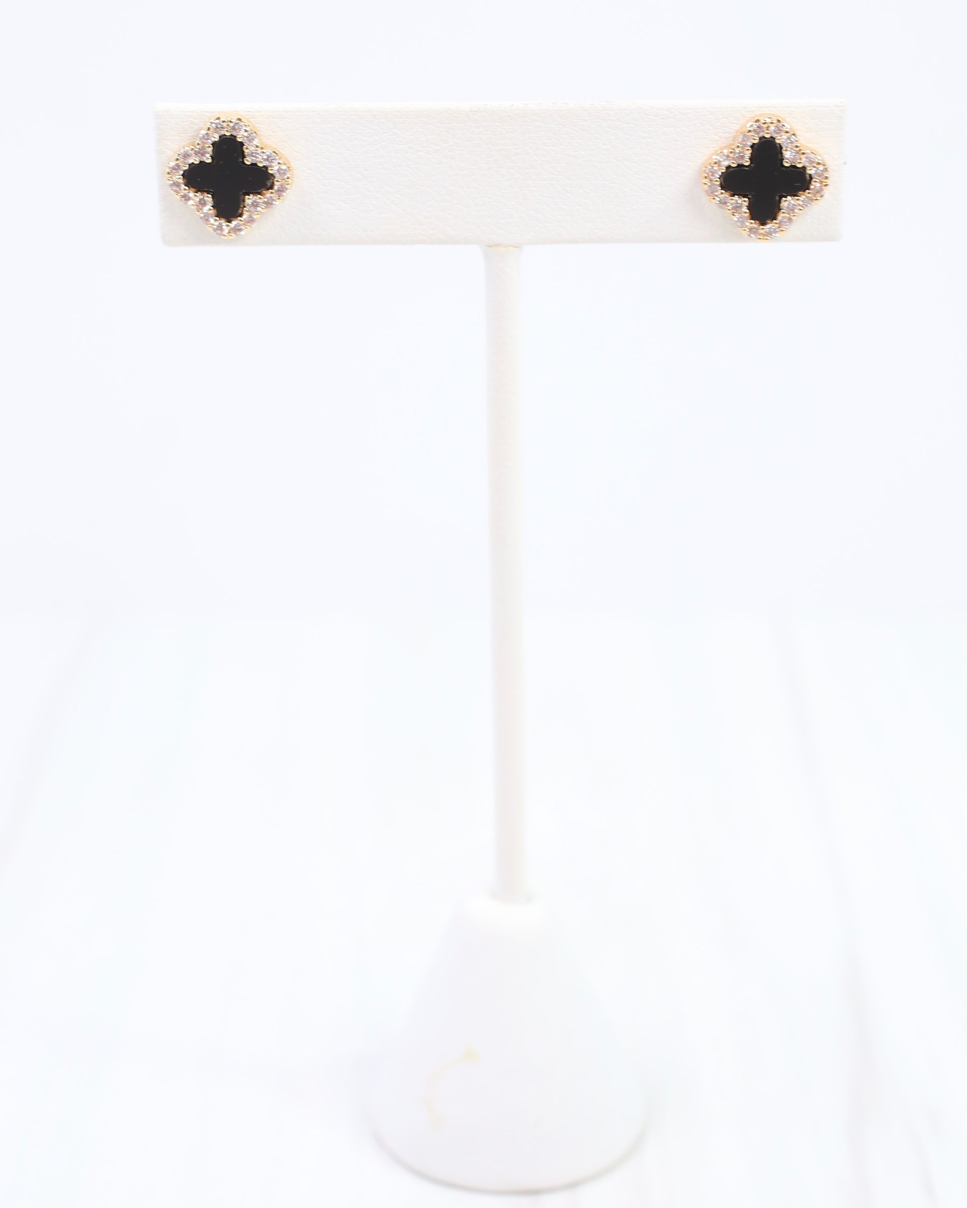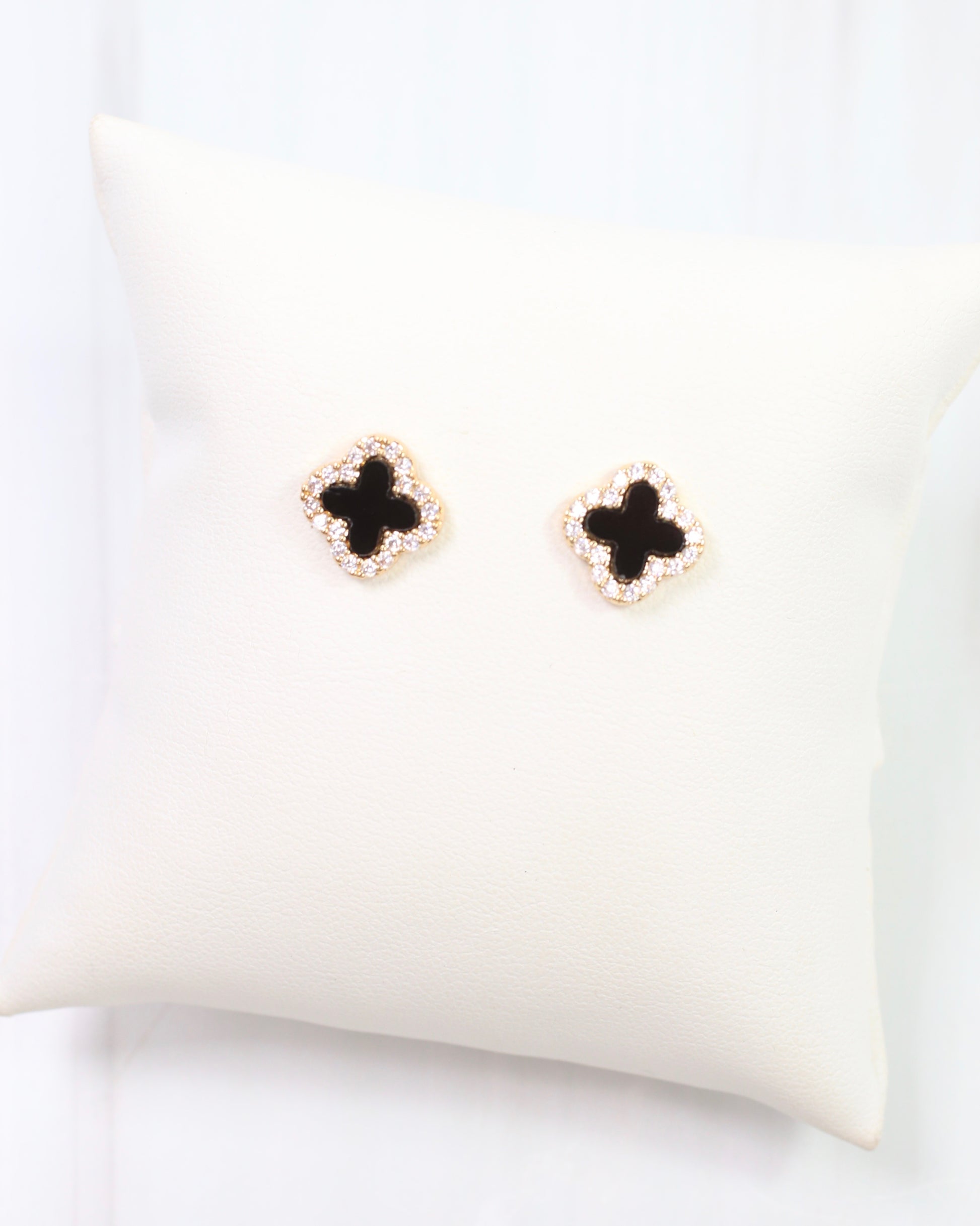 Add a pop of playful charm with the Bisbee CZ Clover Stud Earrings in classic black. These gold-dipped studs feature a black enamel clover, sparkling with a delicate trim of cubic zirconia for just the right amount of shine. Perfect for brightening any outfit with a touch of fun and elegance!