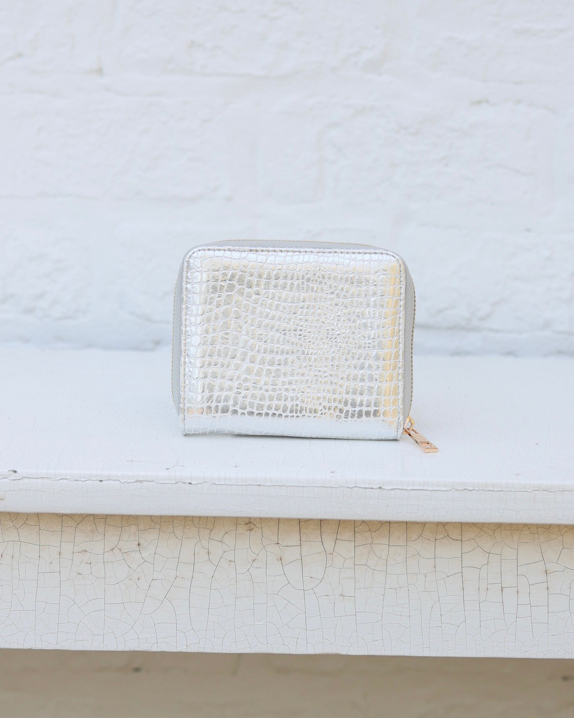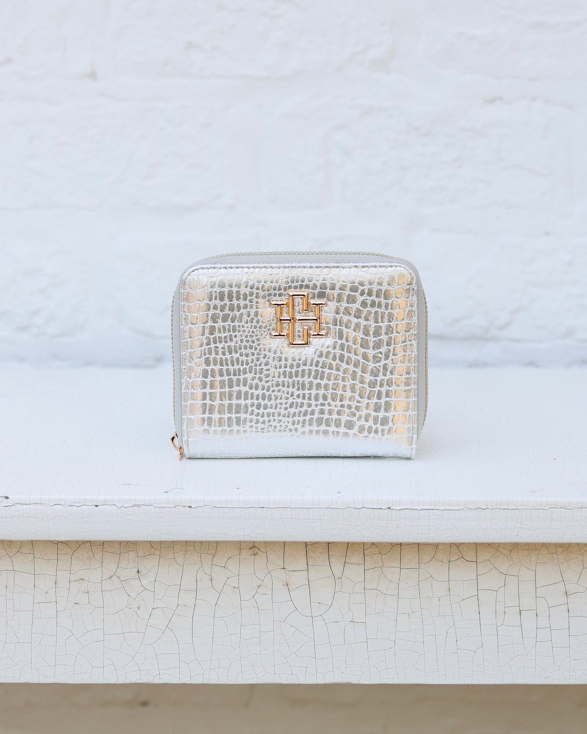 The Blakely Wallet in Silver EC offers a sleek, embossed croc-textured design perfect for everyday elegance. Featuring a full zip closure, it securely holds your essentials inside—card slots, a bill fold, and a zippered coin pocket—all neatly organized for convenience. The classic style is enhanced by a refined gold logo and zipper, making it a stylish yet functional accessory for any occasion.