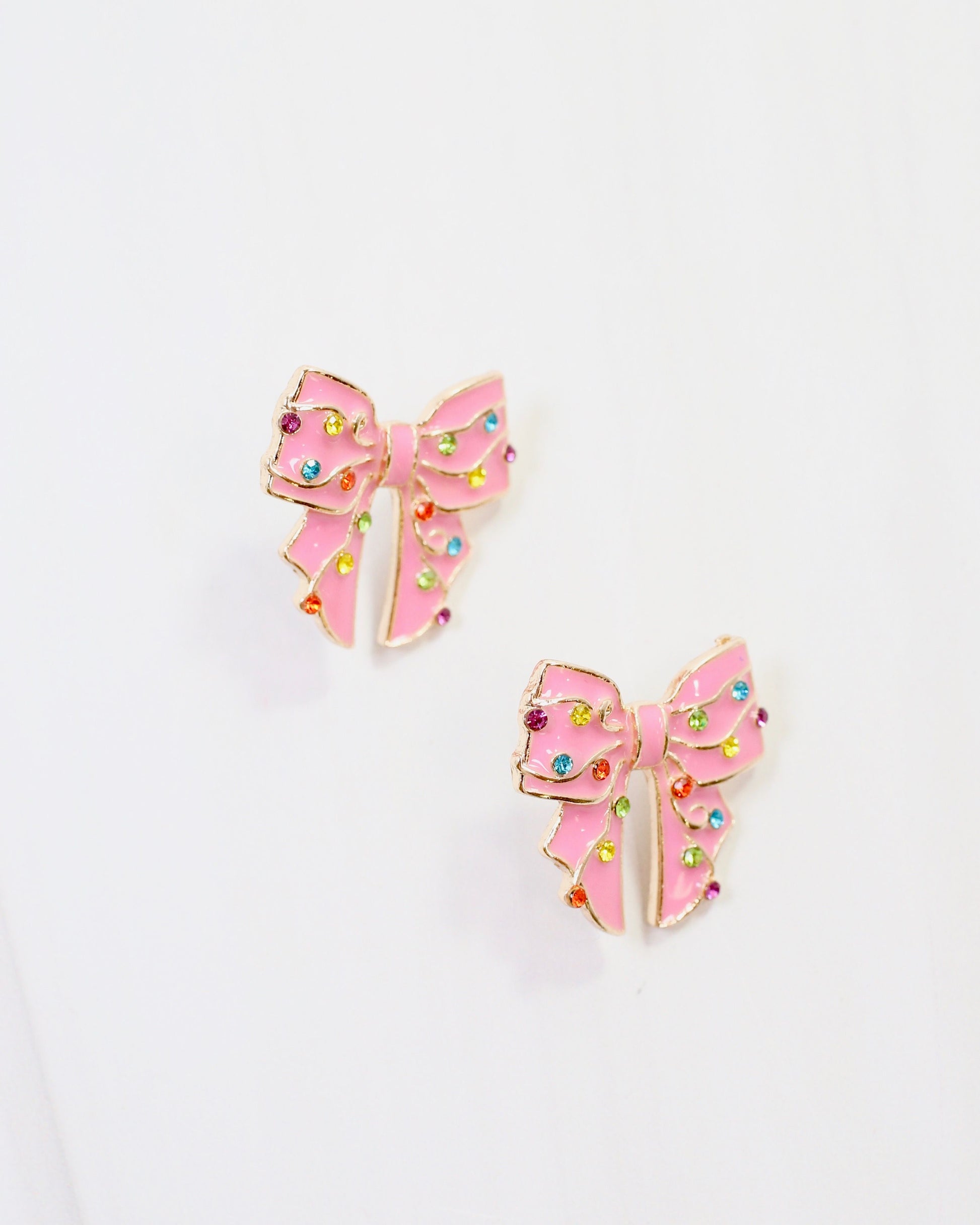 Add a festive touch to your look with the Blitzen Bow Stud in Pink. Featuring a pink enamel bow accented by sparkling multicolored crystals, these studs bring a chic and playful vibe perfect for celebrating the season in style.