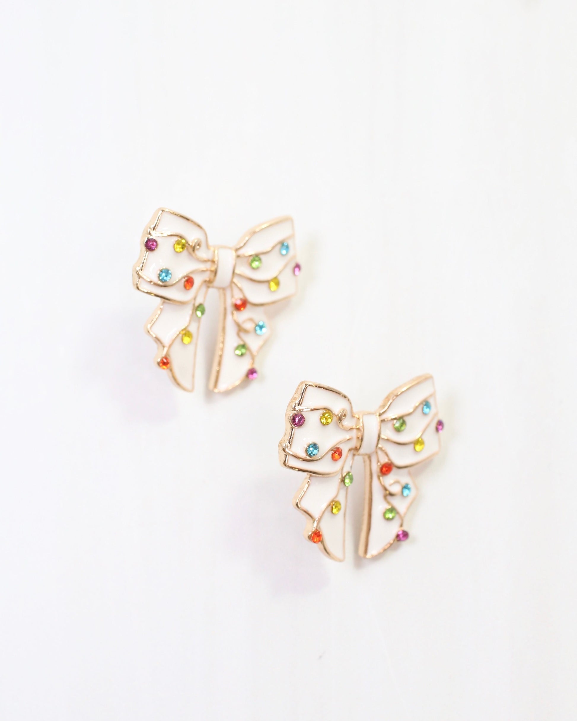 Add a festive touch to your look with the Blitzen Bow Stud in White. Featuring a white enamel bow accented by sparkling multicolored crystals, these studs bring a chic and playful vibe perfect for celebrating the season in style.