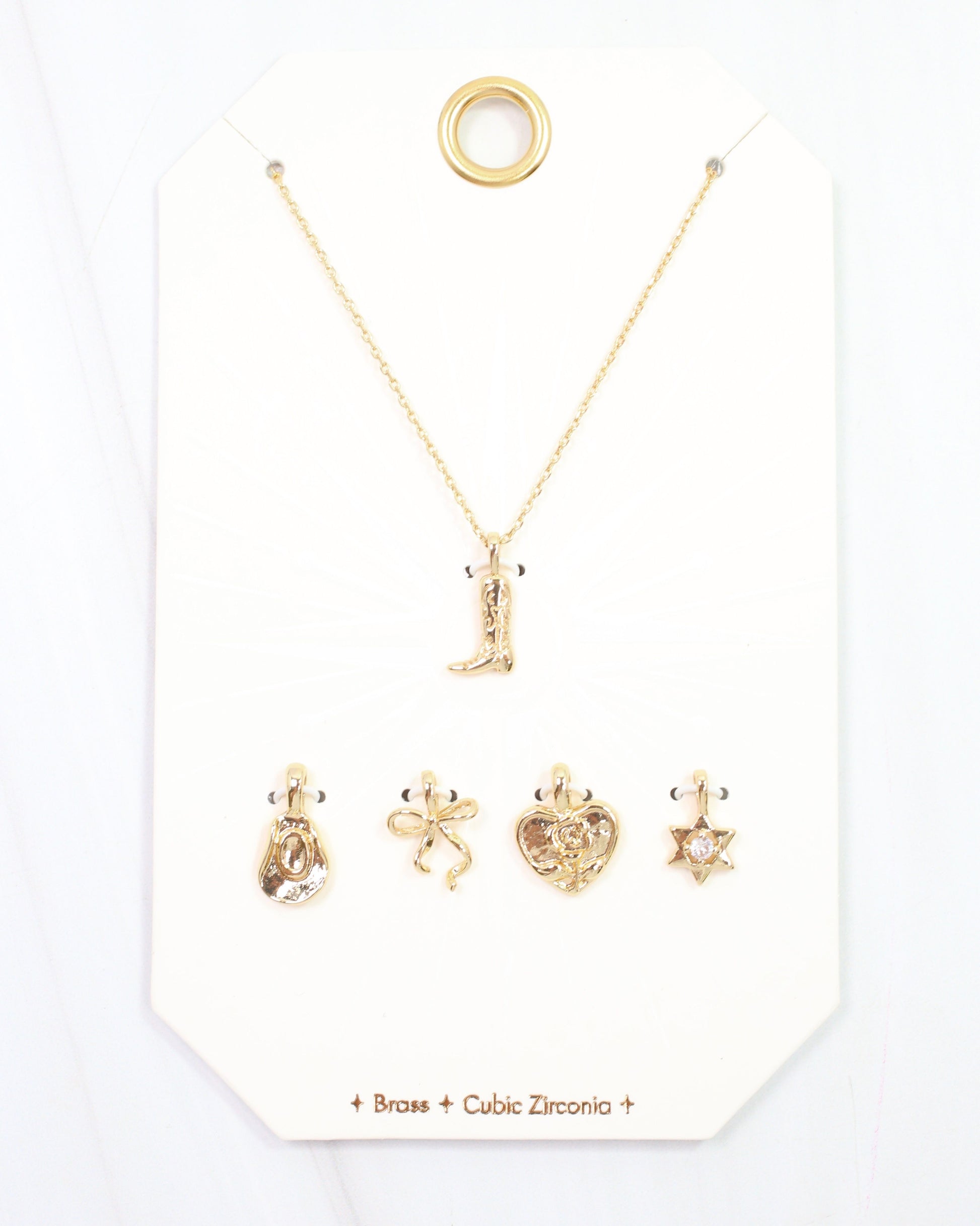 Add a touch of fun to your look with the Boot it Up Charm Necklace Set in Gold. Featuring five playful charms—a boot, star, heart, bow, and cowboy hat—this set brings a whimsical, western-inspired vibe to any outfit. Perfect for layering or wearing solo, these charms add personality and charm wherever you go.