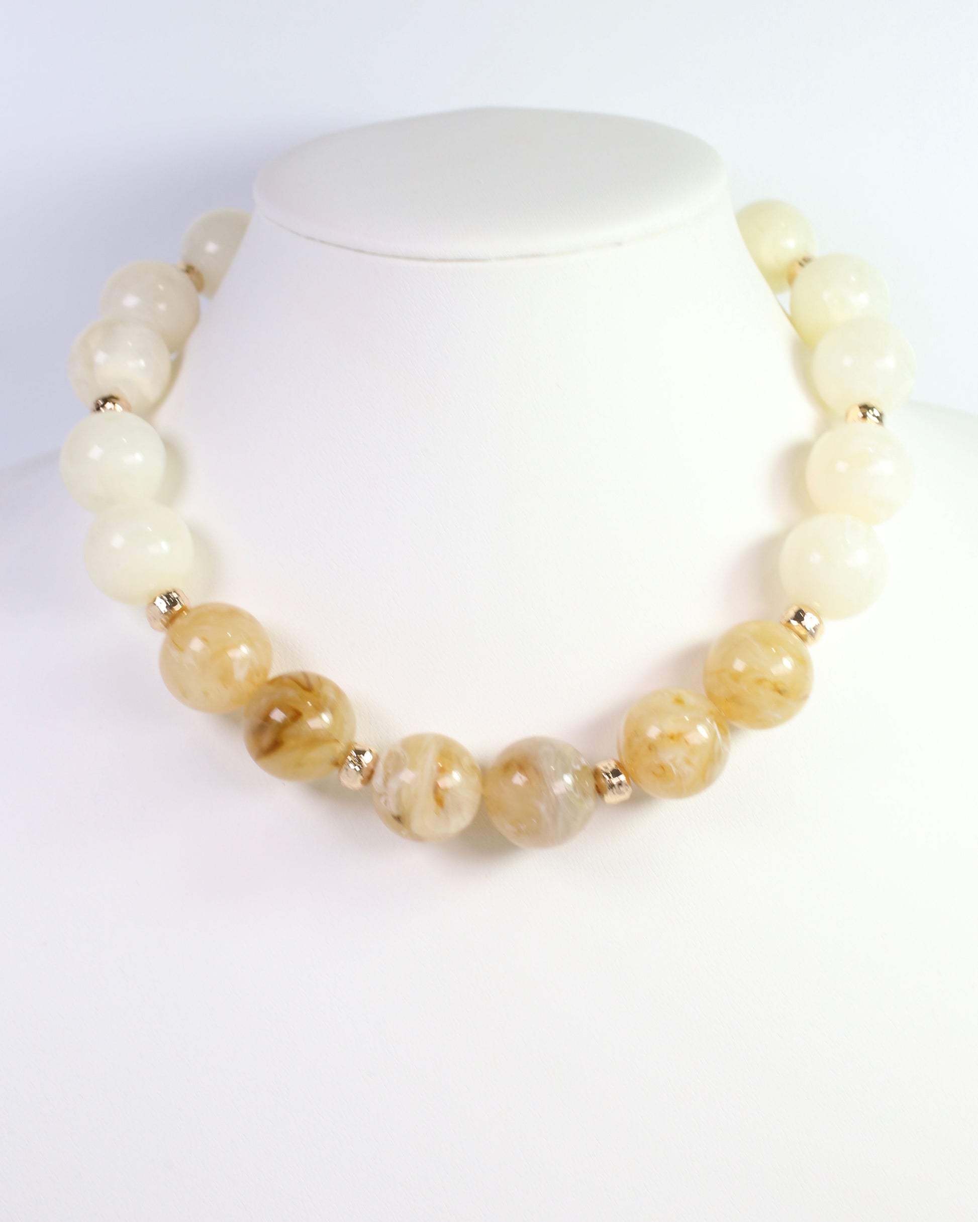 The Bourne Bold Beaded Necklace in Natural combines creamy beige and white beads with delicate gold accents for a sophisticated look. This statement piece balances warmth and shimmer, making it ideal for layering or wearing solo. Perfect for adding refined elegance to any ensemble, it transitions seamlessly from casual daytime wear to evening sophistication.