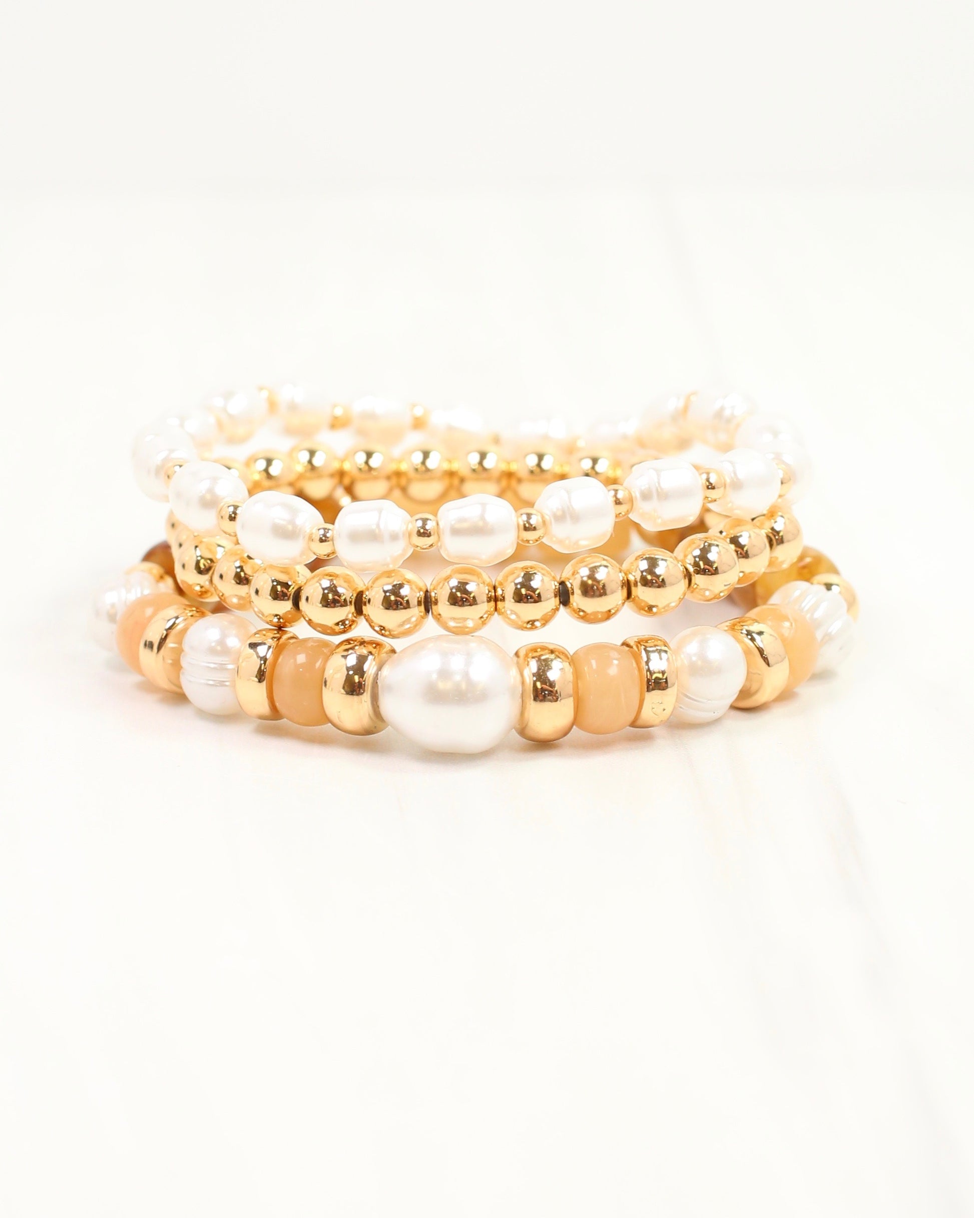 Add a pop of playful charm with the Bowie Bead and Pearl Stretch Bracelet Set in Brown. This trio features one strand of classic pearls, one with shiny gold balls, and a colorful beaded strand accented with gold and pearls. Perfect for stacking or wearing solo, these stretchy bracelets bring fun and flair to any outfit.