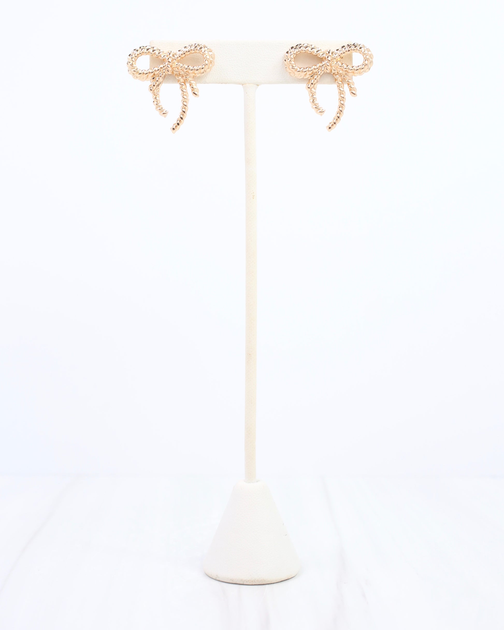 Add a touch of whimsy to your look with the Branson Textured Bow Stud Earring in Gold. These shiny, rope-textured bows create a playful twist on a classic stud, perfect for everyday charm or brightening up your party outfit.
