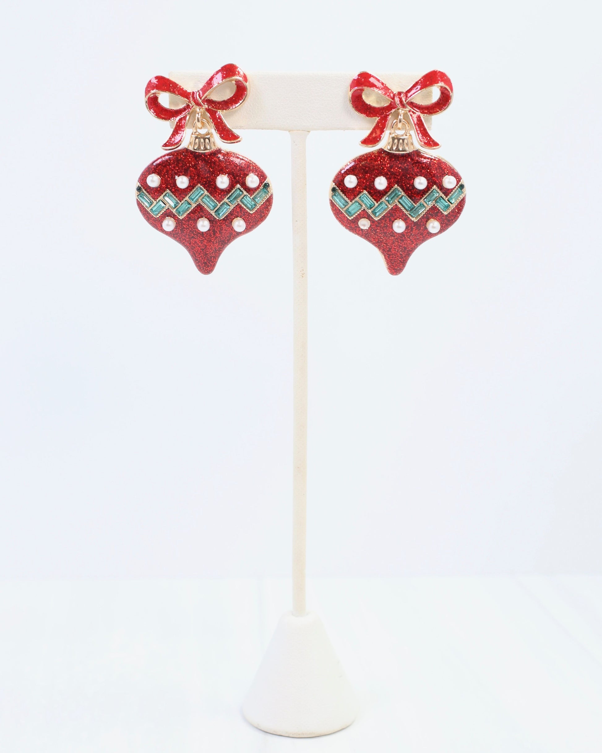 The Bridger Bow and Ornament Earrings in red feature an adorable glittered enamel red bow with a red ornament dangle. Trimmed with pearls and highlighted by green zigzag crystal stones, these statement earrings add a festive and fashionable touch to your holiday look.