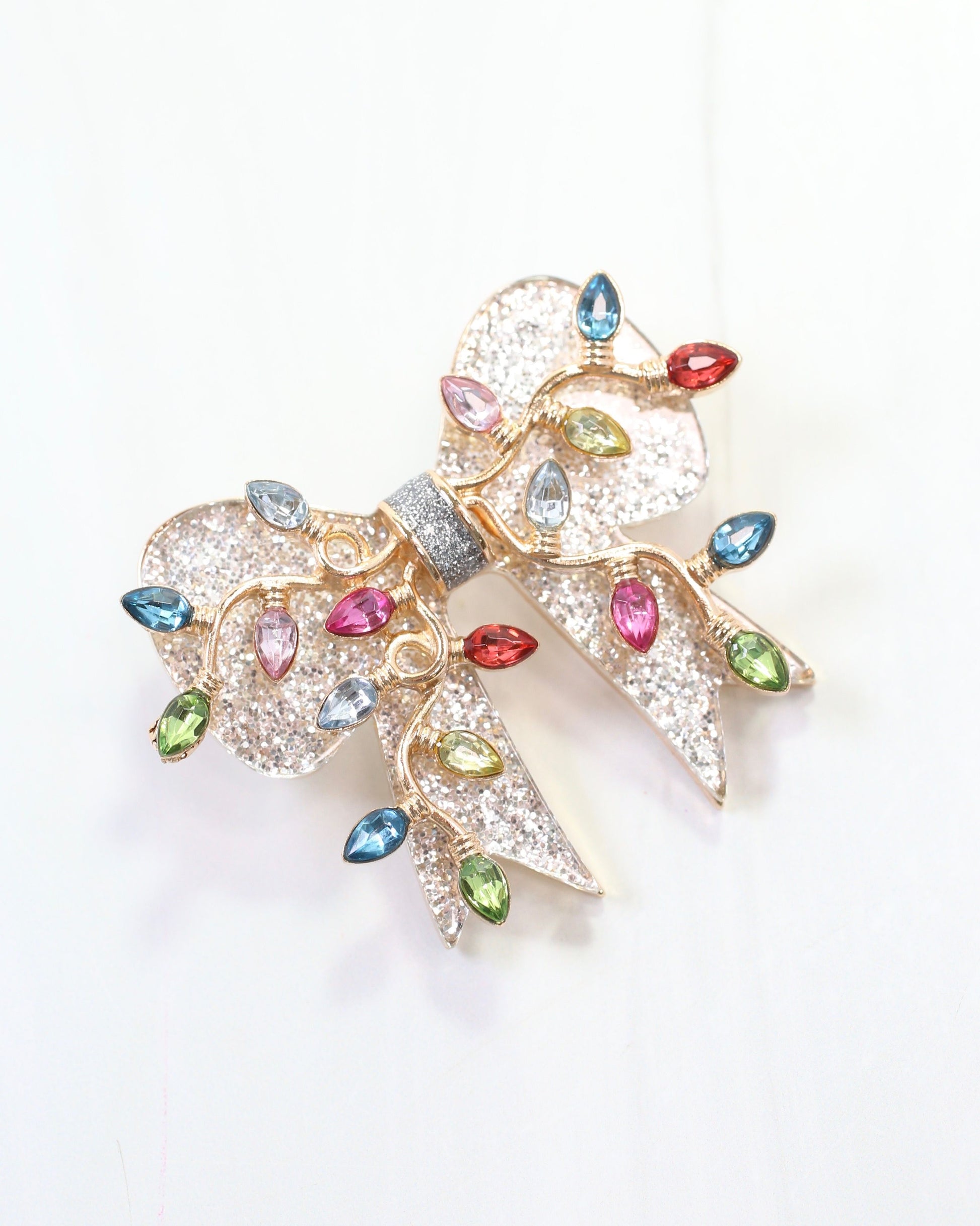 Add a festive touch to any outfit with the Bright and Merry Bow Brooch in Silver. This glittered acetate bow pin features colorful crystals and gold accents that mimic the sparkle of Christmas lights, making it a chic accessory for holiday celebrations. Perfect for adding a stylish, joyful glow to your seasonal look.