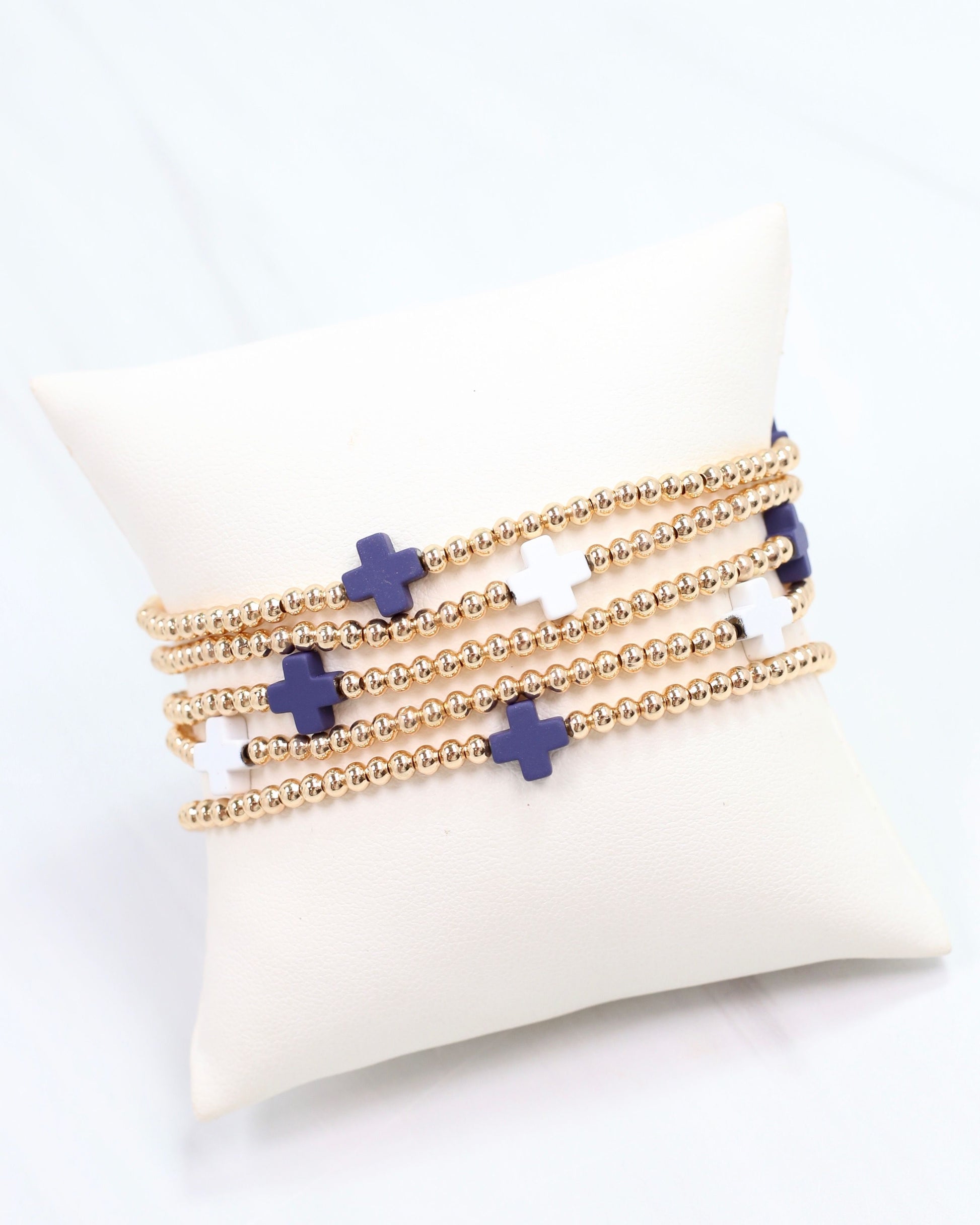 Show off your school spirit with the Brittany Cross Bracelet Set in Navy and White! These stretchy gold beaded stacking bracelets feature vibrant solid-colored crosses, adding a fun and stylish touch to any outfit. Perfect for layering or wearing solo, they’re the ideal way to celebrate your pride with a playful flair.