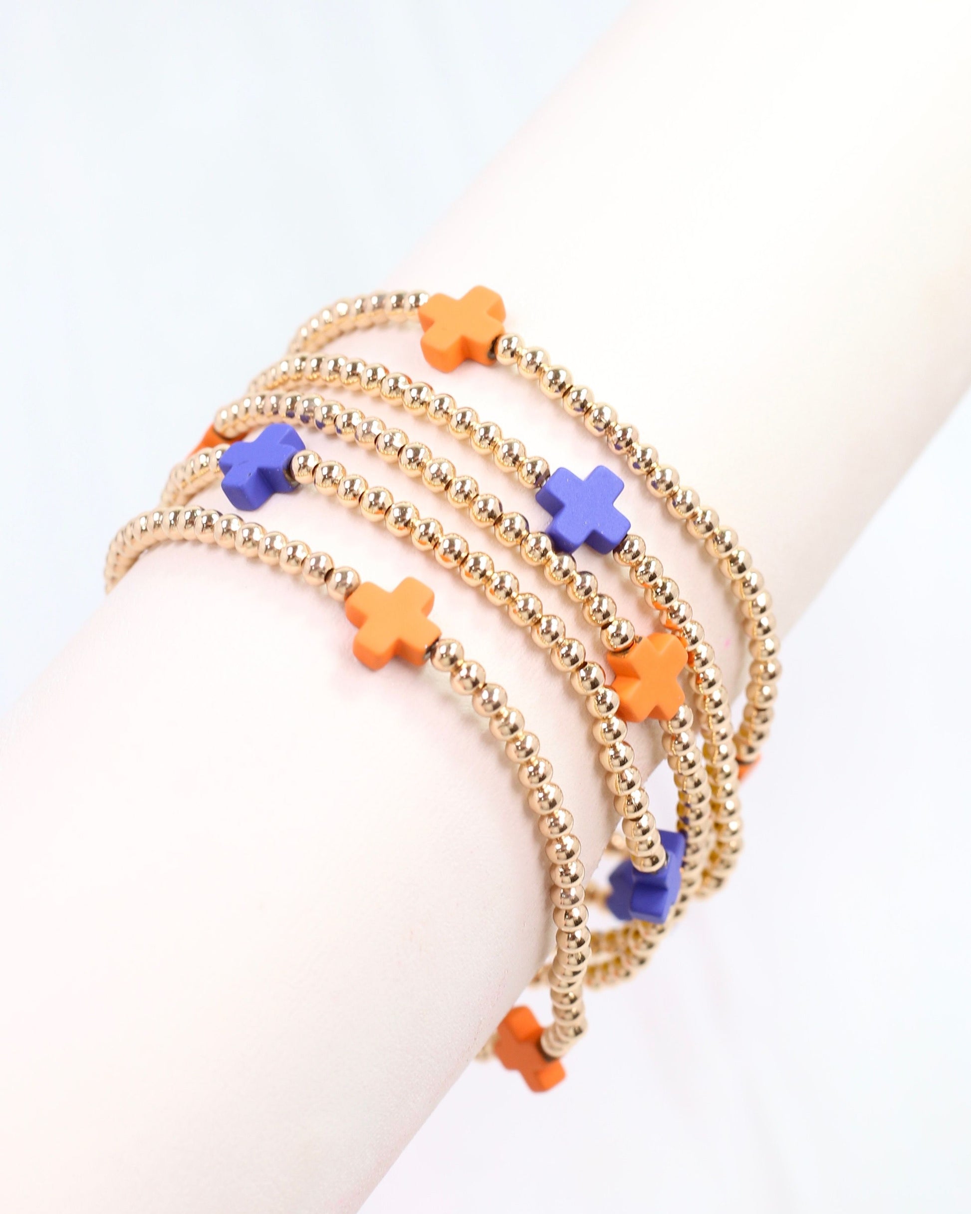 Show off your school spirit with the Brittany Cross Bracelet Set in Orange and Blue! These stretchy gold beaded stacking bracelets feature vibrant solid-colored crosses, adding a fun and stylish touch to any outfit. Perfect for layering or wearing solo, they’re the ideal way to celebrate your pride with a playful flair.