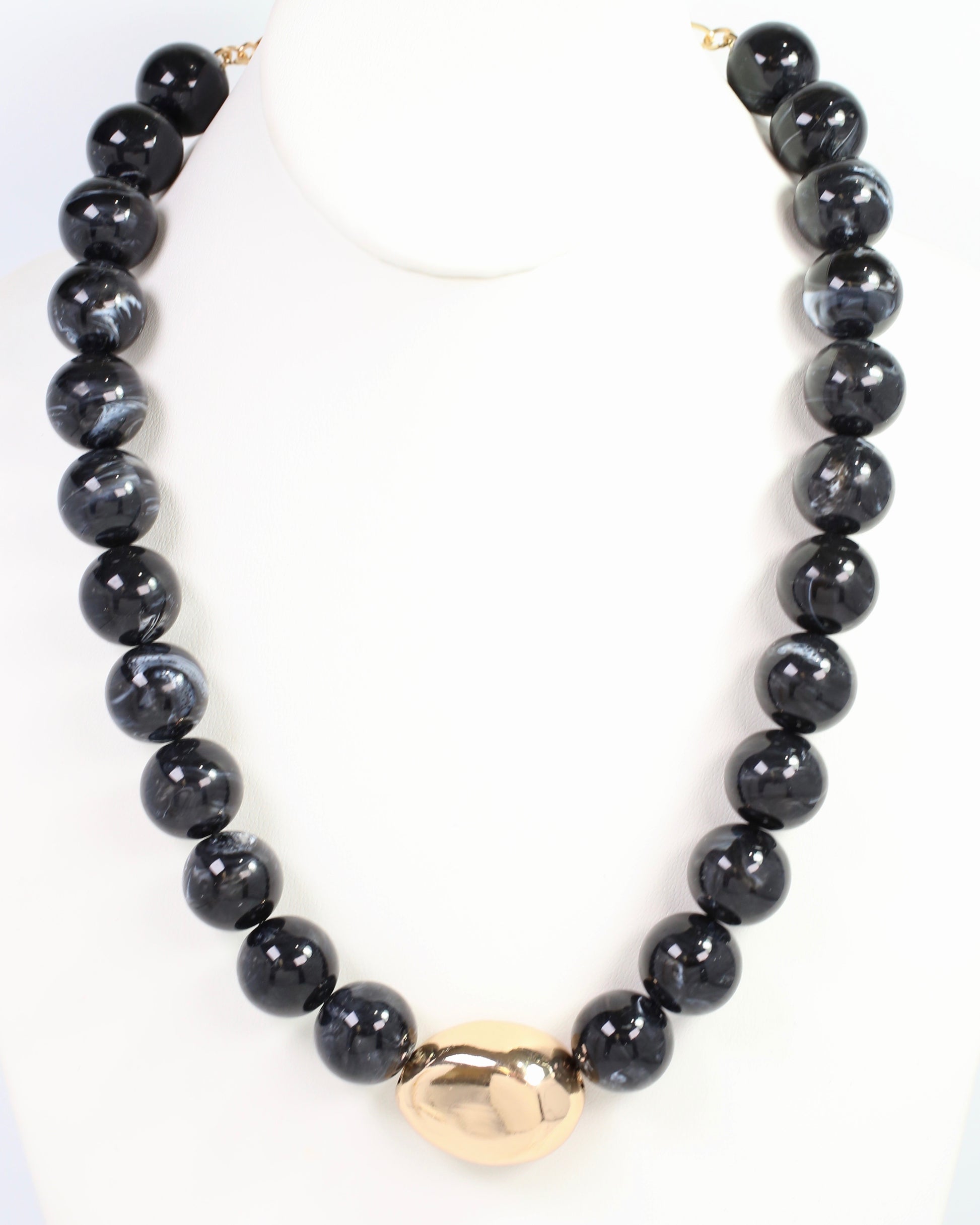 Add a pop of subtle color to any outfit with the Brooklyn Bold Stone Necklace in black. Featuring chunky marbled round beads paired with a shiny gold statement bead, this necklace brings bold style and fun energy to your look. Perfect for making a confident, colorful statement wherever you go!