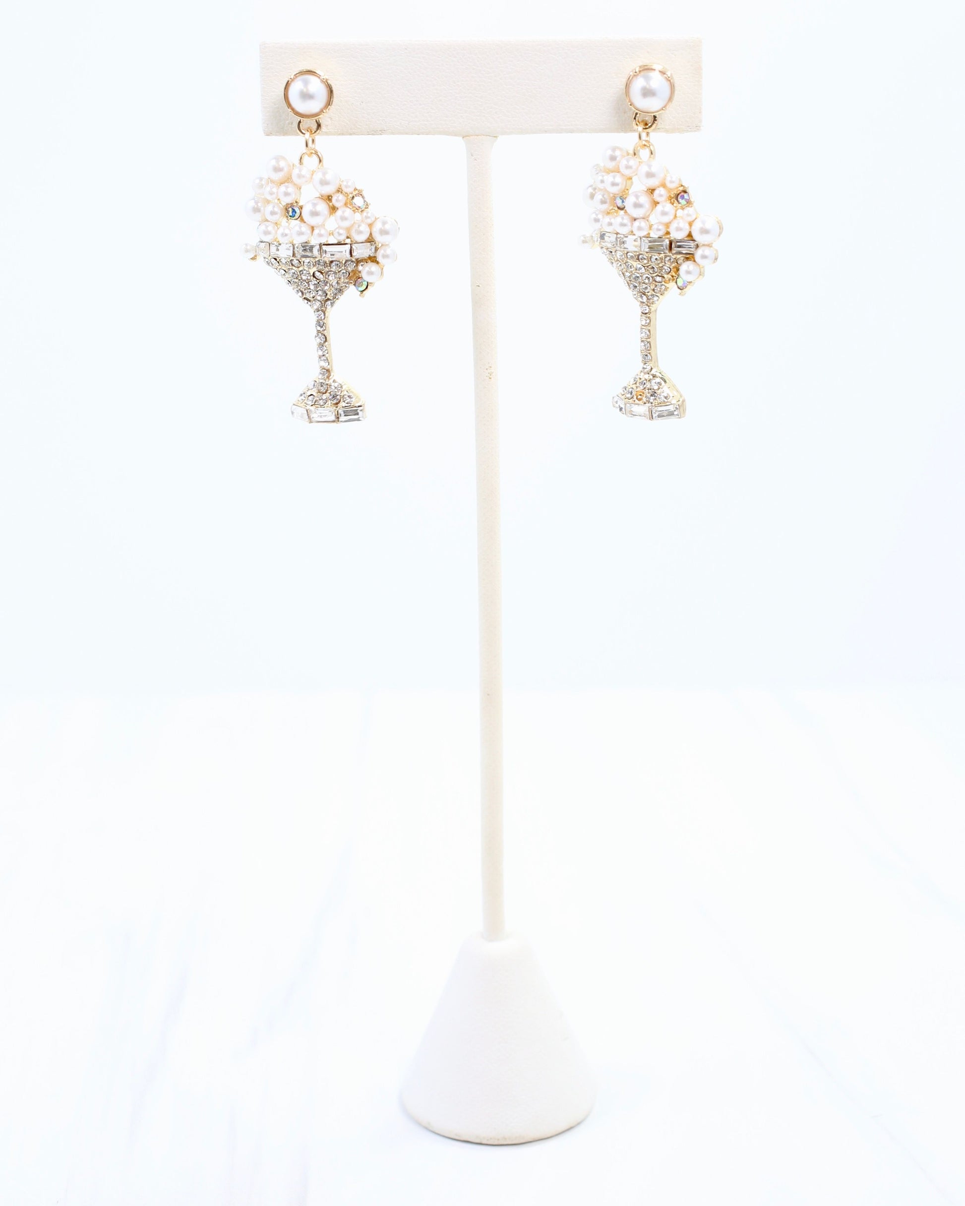 The Bubbles and Champagne Earrings in Gold showcase pave cocktail glasses adorned with sparkling CZ stones and delicate pearl bubbles. These elegant earrings bring a chic, celebratory vibe to any outfit, perfect for embracing life’s special moments with style.