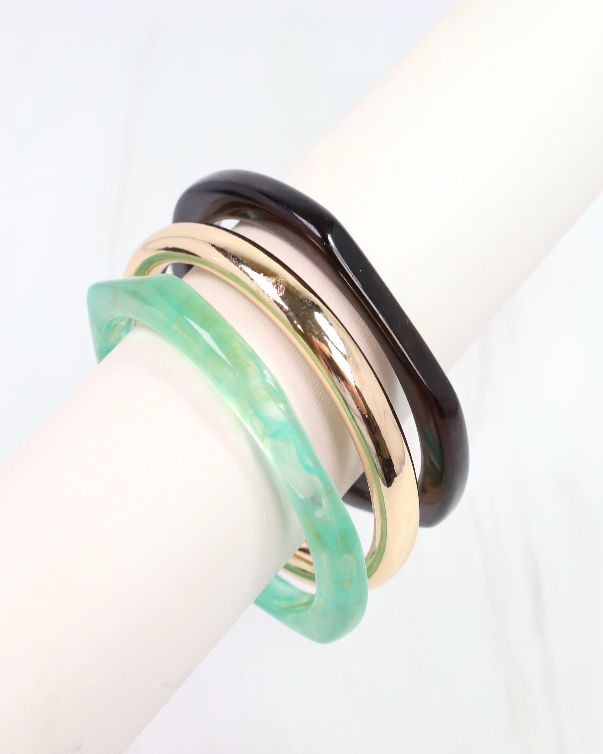 Add a splash of fun to your wrist with the Callie Bracelet Set in Green! This trio includes two vibrant acetate bangles and one sleek gold bangle. Mix and match by wearing them together for a bold statement or separately to switch up your style anytime. Perfect for playful layering and effortless charm.