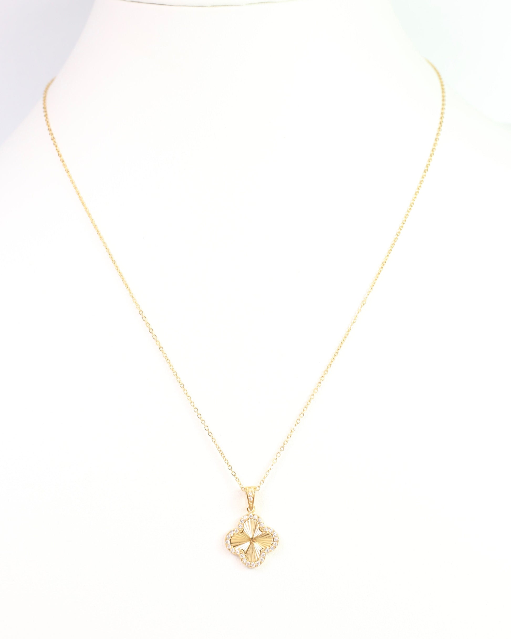Add a touch of luck and sparkle with the Cambridge Clover Necklace in Gold. Featuring a ribbed gold clover pendant edged with shimmering pave cubic zirconia, this delicate necklace brings charm and shine to any outfit. Crafted from stainless steel and water resistant.