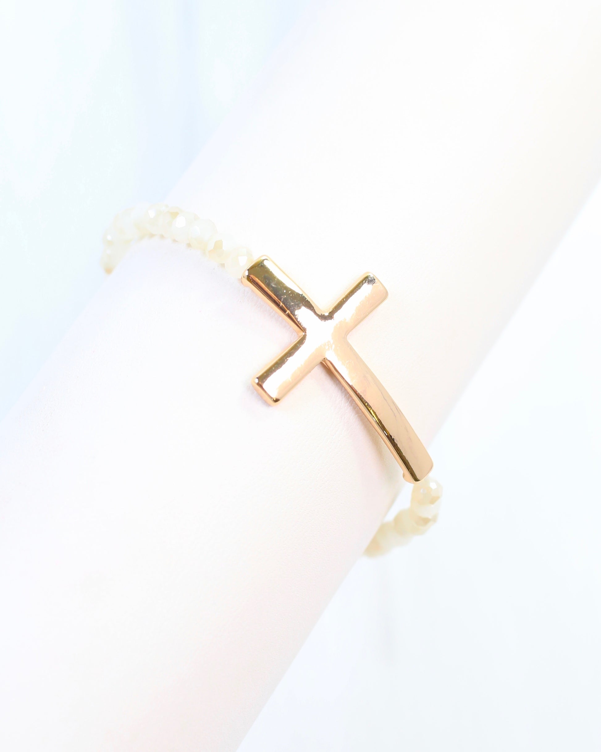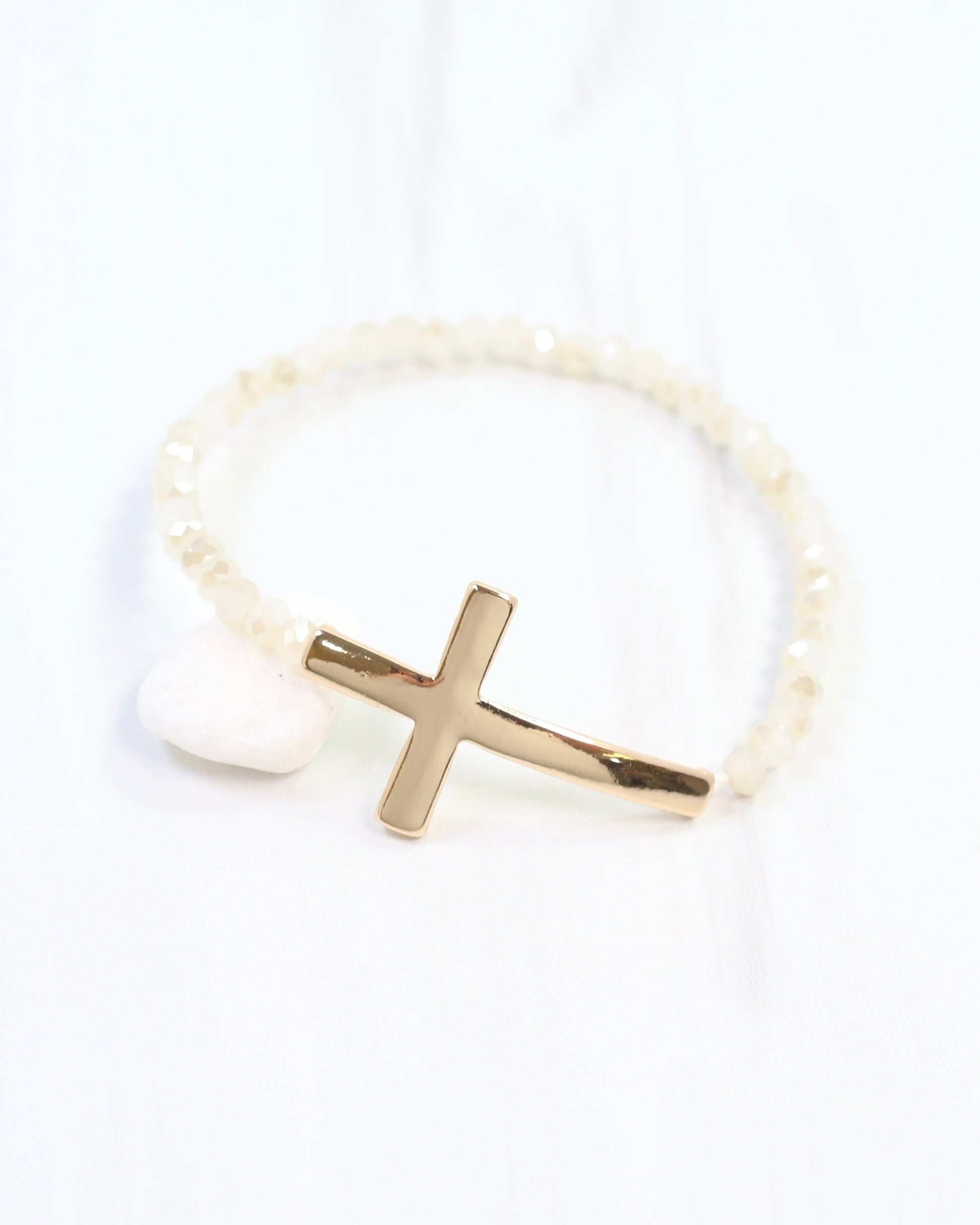 Elevate your style with the Camille Cross and Bead Bracelet in Ivory. Featuring delicate ivory beads and a stylish side cross charm, this stretch bracelet offers a comfortable fit and a chic, versatile look perfect for layering or wearing alone. Add a subtle yet fashionable touch to any outfit with this elegant accessory.