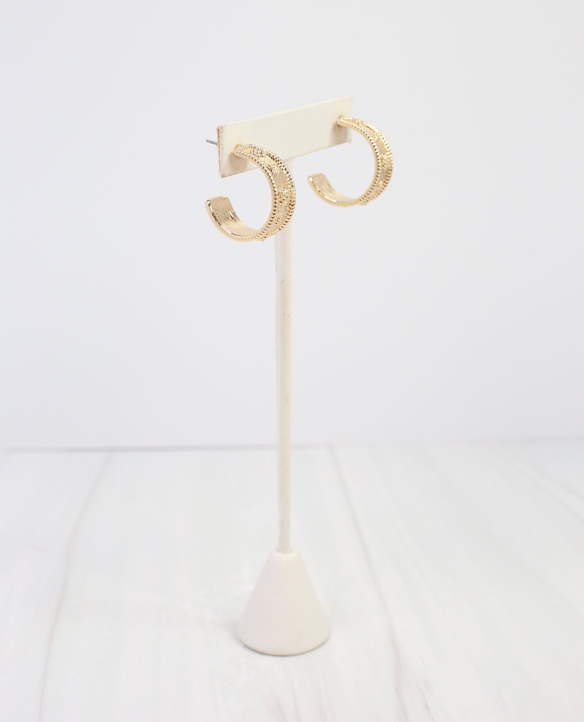 The Canton Textured Hoop Earrings in gold offer a refined blend of classic shape and intricate texture, creating a sophisticated accessory that elevates any ensemble with subtle elegance.