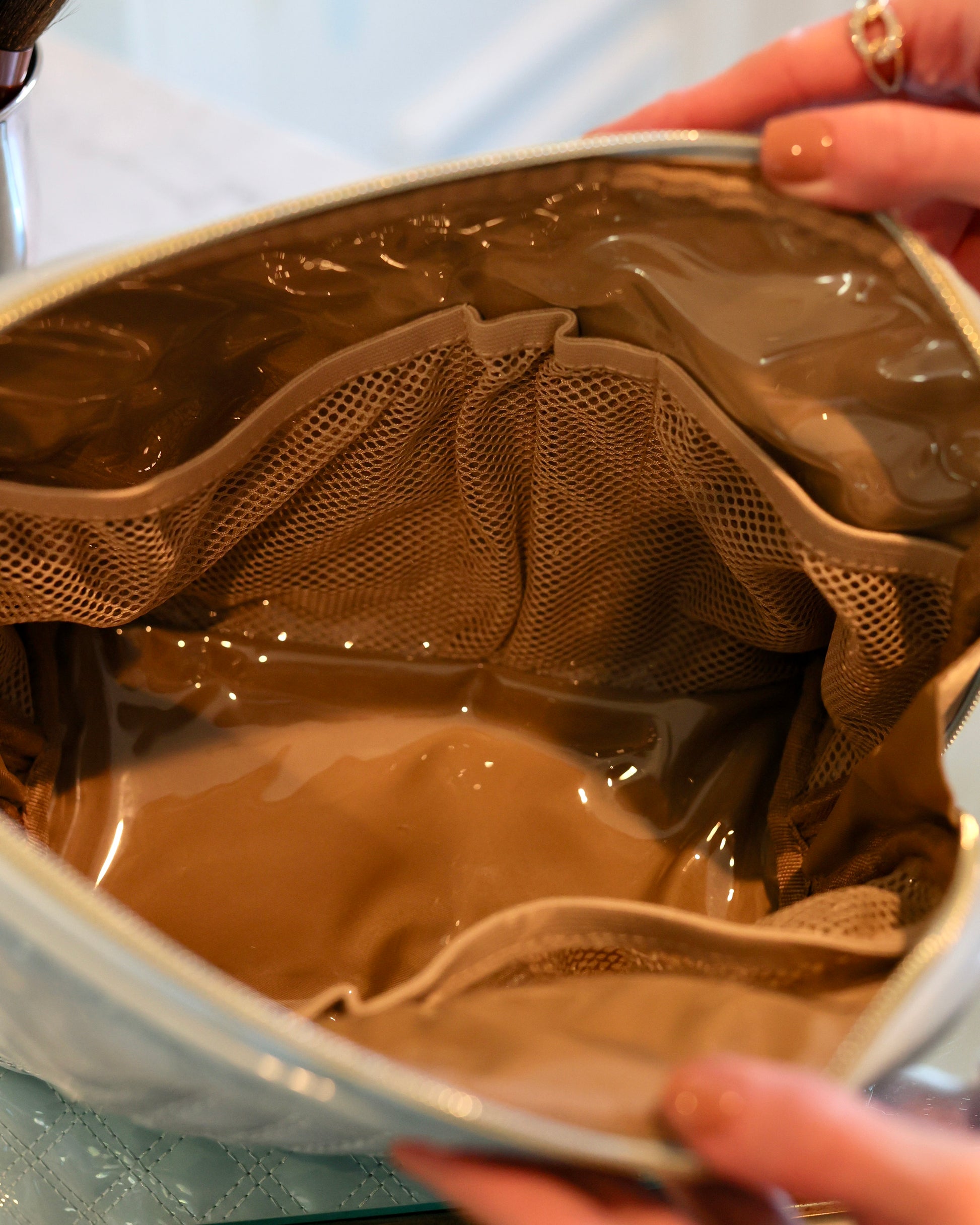 This beautiful vegan patent leather pouch is part of our makeup and travel collection and features a stylish quilted fabric design. The elongated zipper provides easy access, making it perfect for organizing makeup, toiletries, and hair accessories. The spacious interior is lined with nude fabric with a clear protective fabric that is easily wipeable. It also has mesh pockets to keep cosmetics neatly stored and accessible.