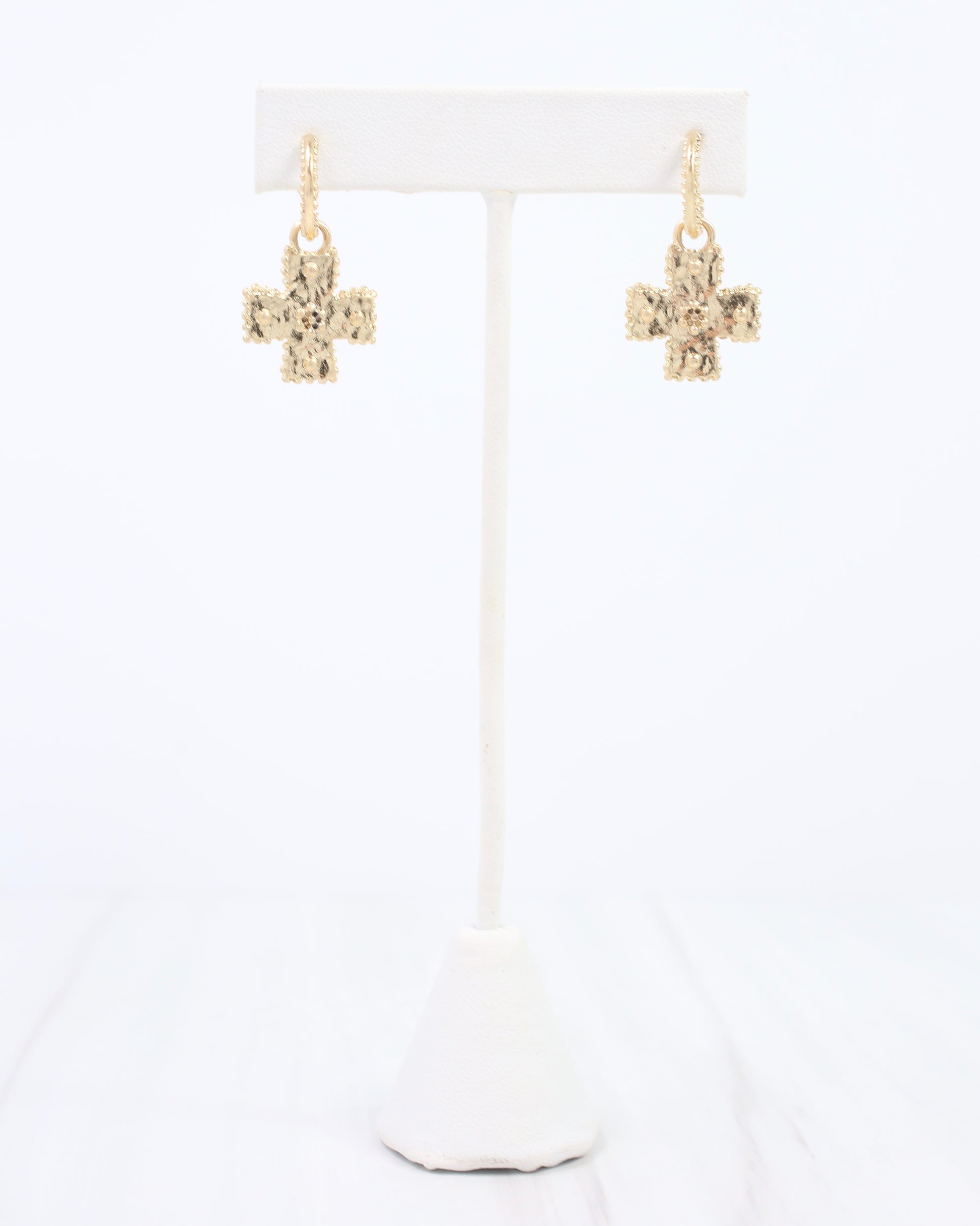 Add a touch of timeless charm with the Carol Cross Dangle Hoop in Worn Gold. Featuring a delicate old-world cross accented with dotted edges and tiny dot details, this small hoop brings a playful, vintage vibe to any outfit. Perfect for those who love a little history with their sparkle!