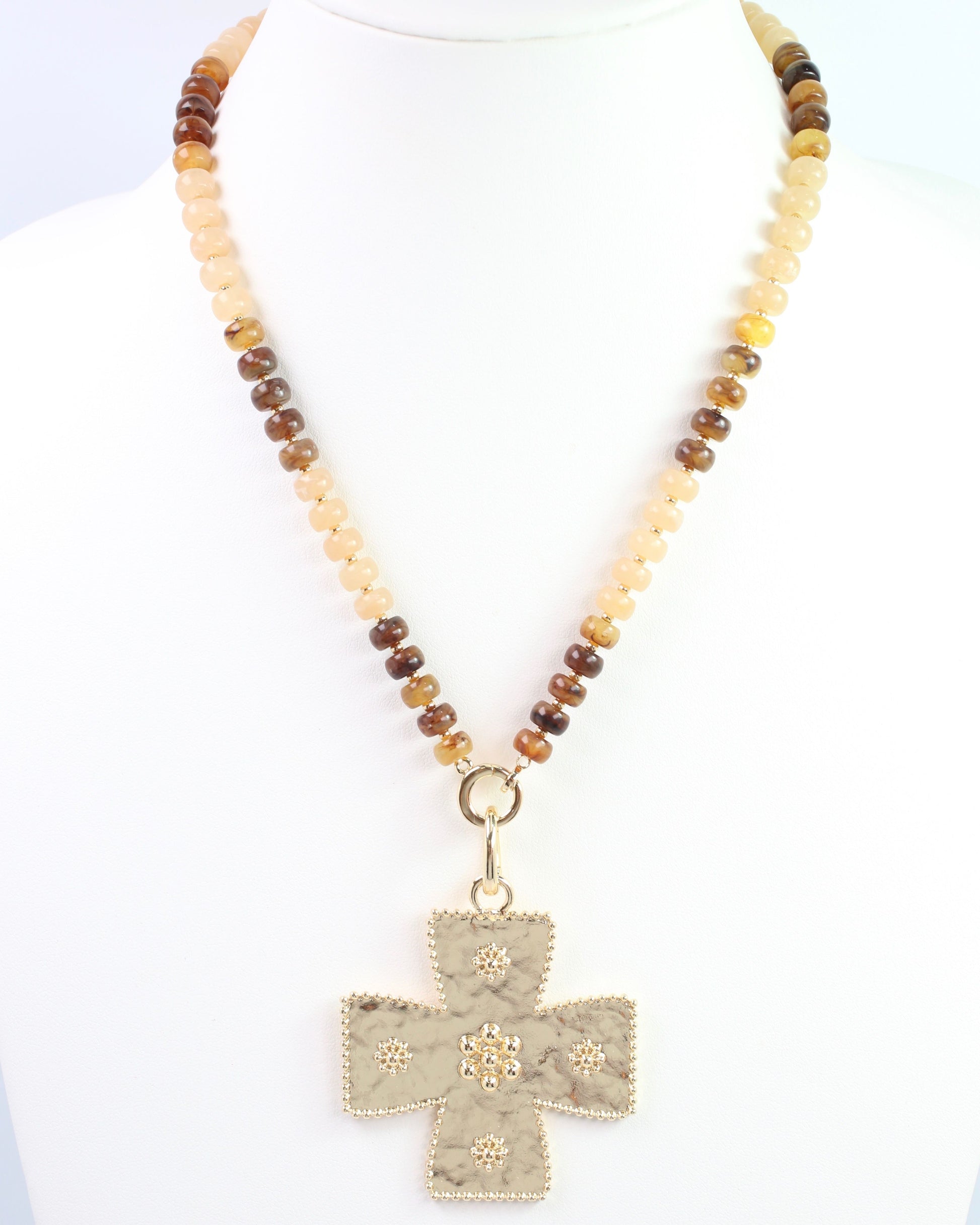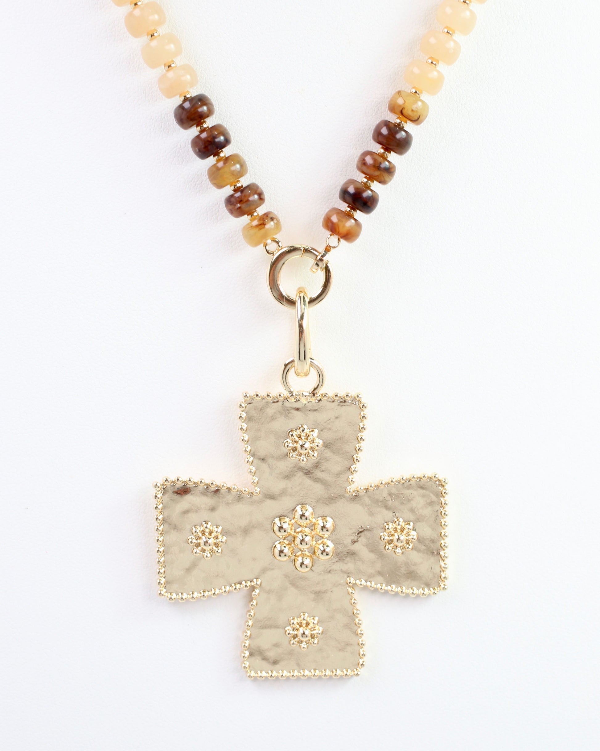 Add a touch of sparkle with the Carol Large Cross Charm in shiny gold! Featuring a beaded edge and delicate bead details, this charm easily clips on with its hinged clasp. Perfect for jazzing up scarves, necklaces, or handbags, it’s a fun way to charm your style wherever you go.