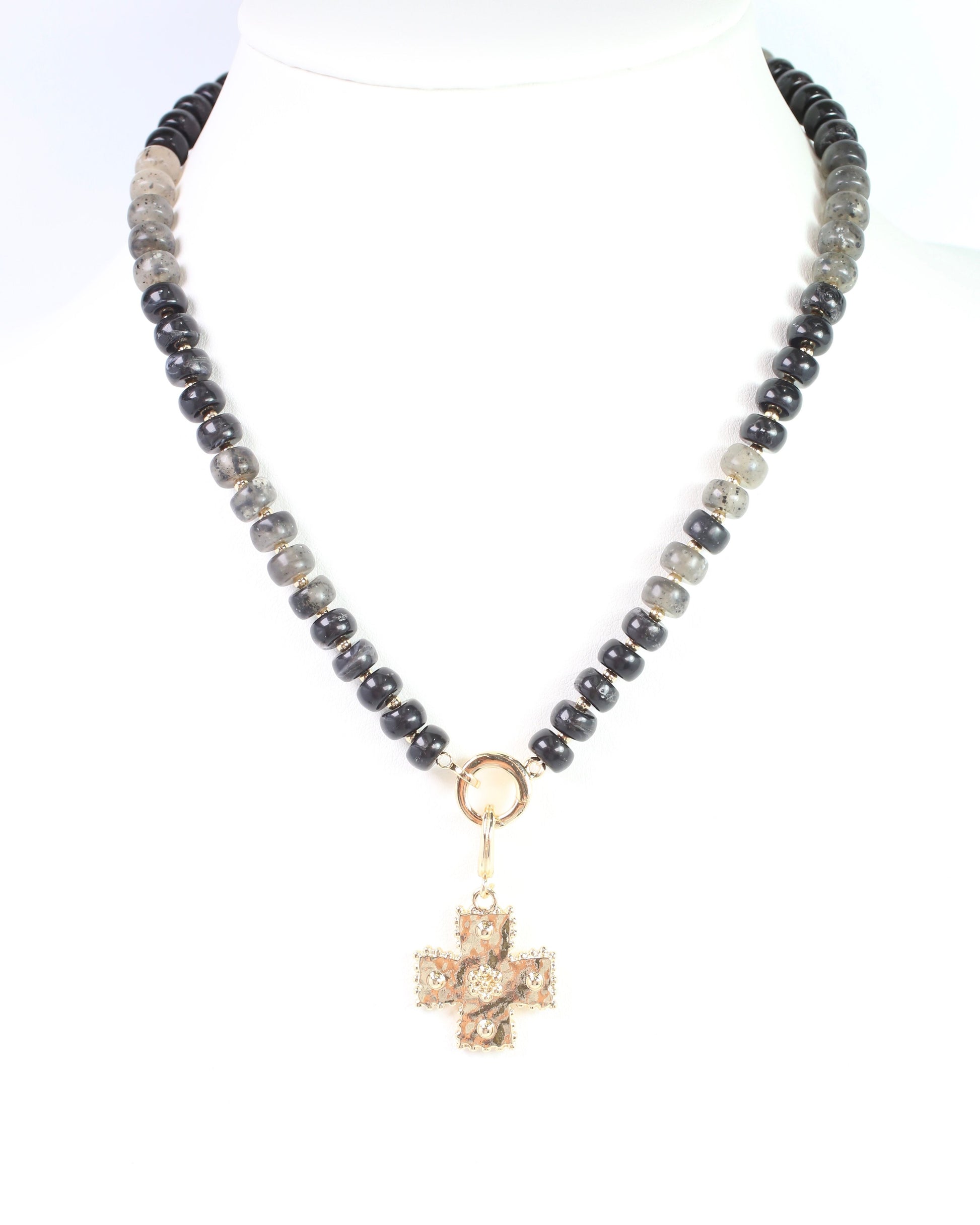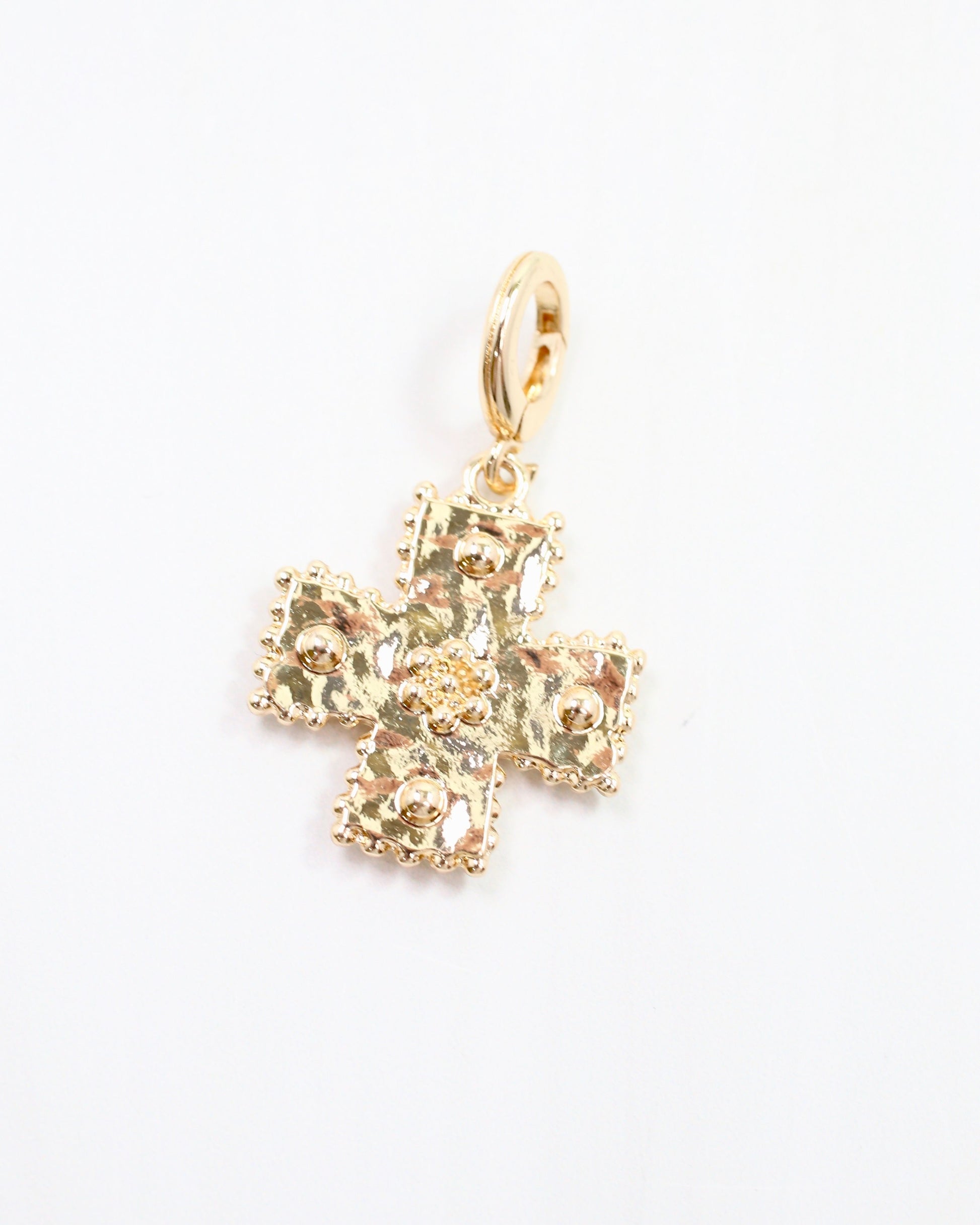 The Carol Mini Cross Charm in Gold adds playful sparkle with its beaded edges and detailed blocky cross design. Its hinged clasp makes it easy to clip onto any bracelet or necklace for a fun, personalized look.
