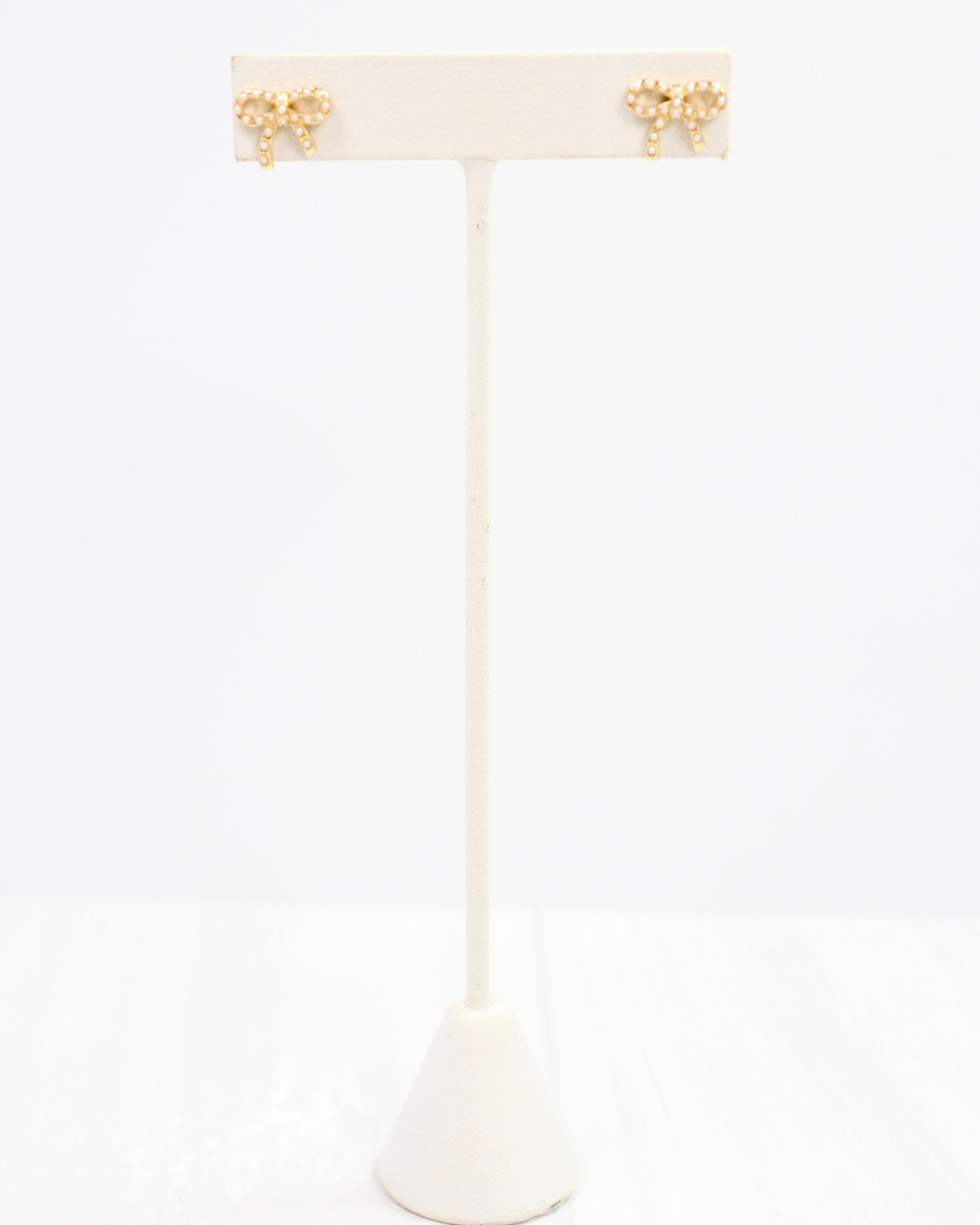 Add a touch of sweet simplicity to your outfit with the Carolina Pearl Bow Studs in gold. These petite stud earrings feature a delicate bow design with a pave pearl inlay, all set in durable gold plating. Perfect for any occasion!