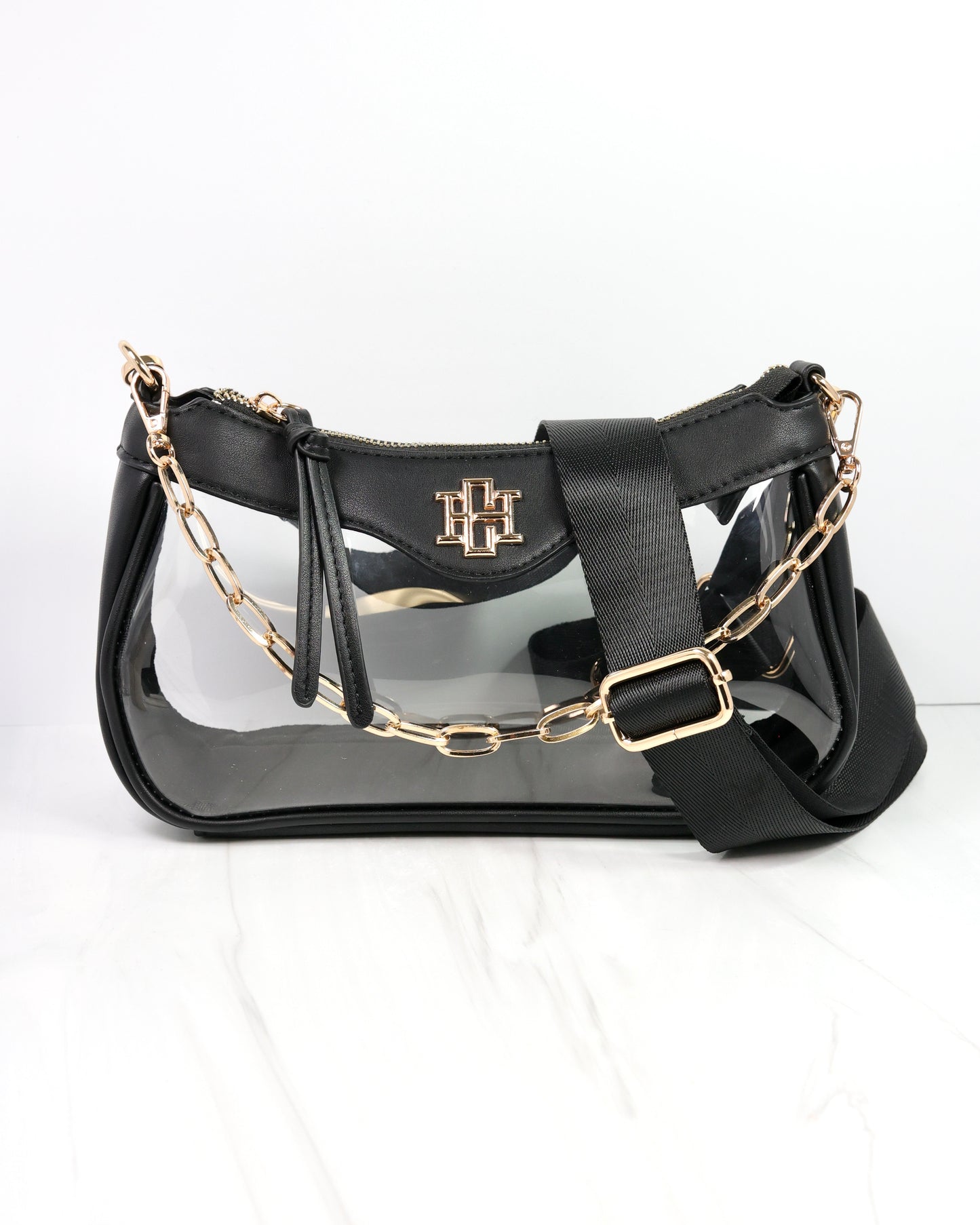 The Cassidy Clear Crossbody in Black combines style and comfort effortlessly. Featuring a removable chain and a soft nylon strap, it adapts to your look and mood. Perfectly pairs with our gameday purse chains and the Molly cardholder for a coordinated, fashionable ensemble.