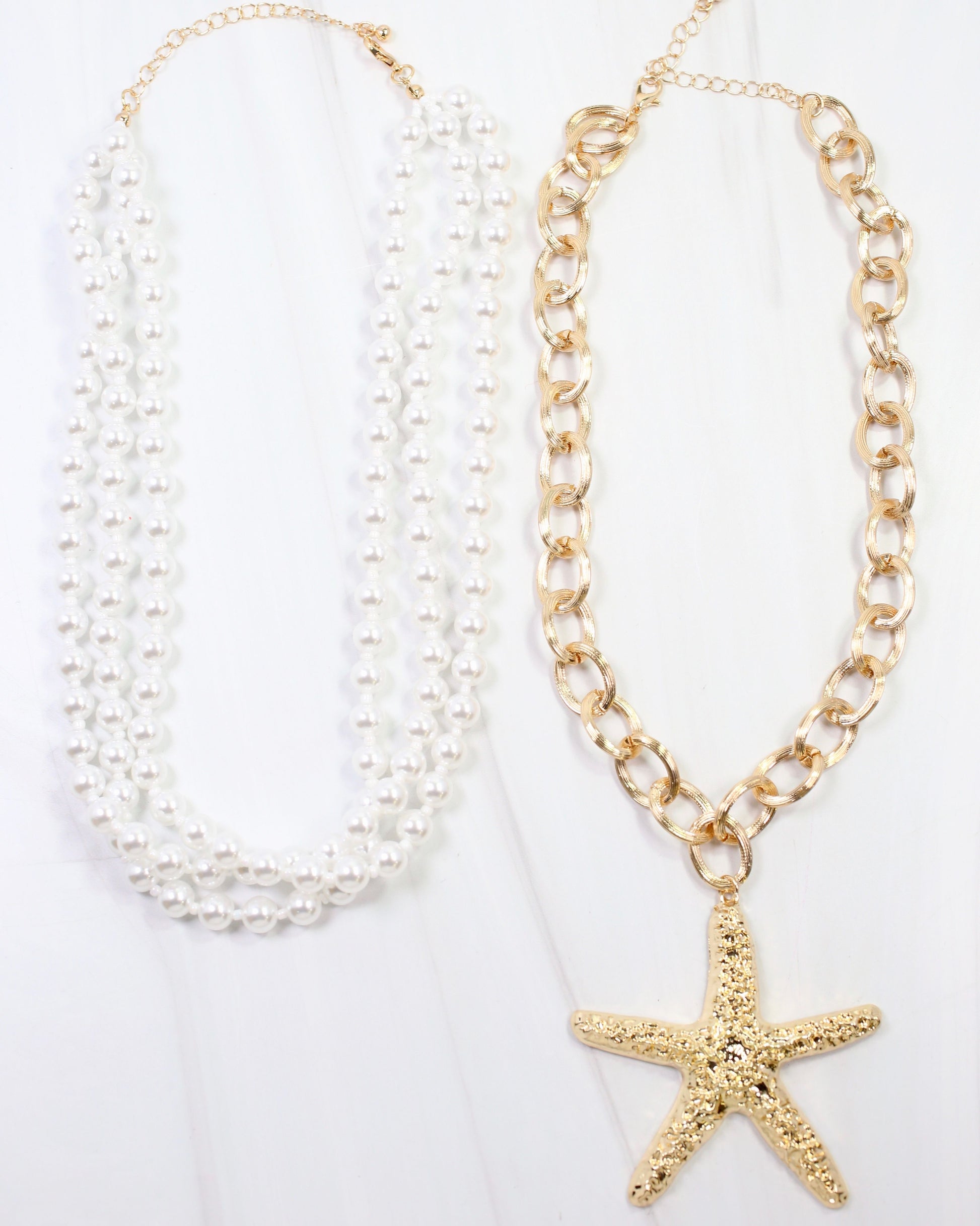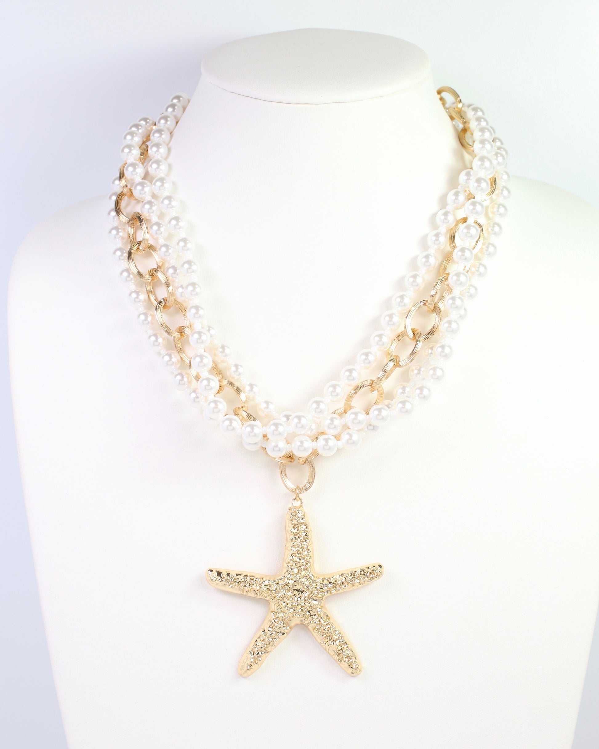 Starfish charm meets pearl elegance in this playful gold layered necklace. A solid gold starfish paired with lustrous pearls and a polished link chain creates instant coastal magic. Perfect for stacking or wearing solo—pure ocean-inspired fun!