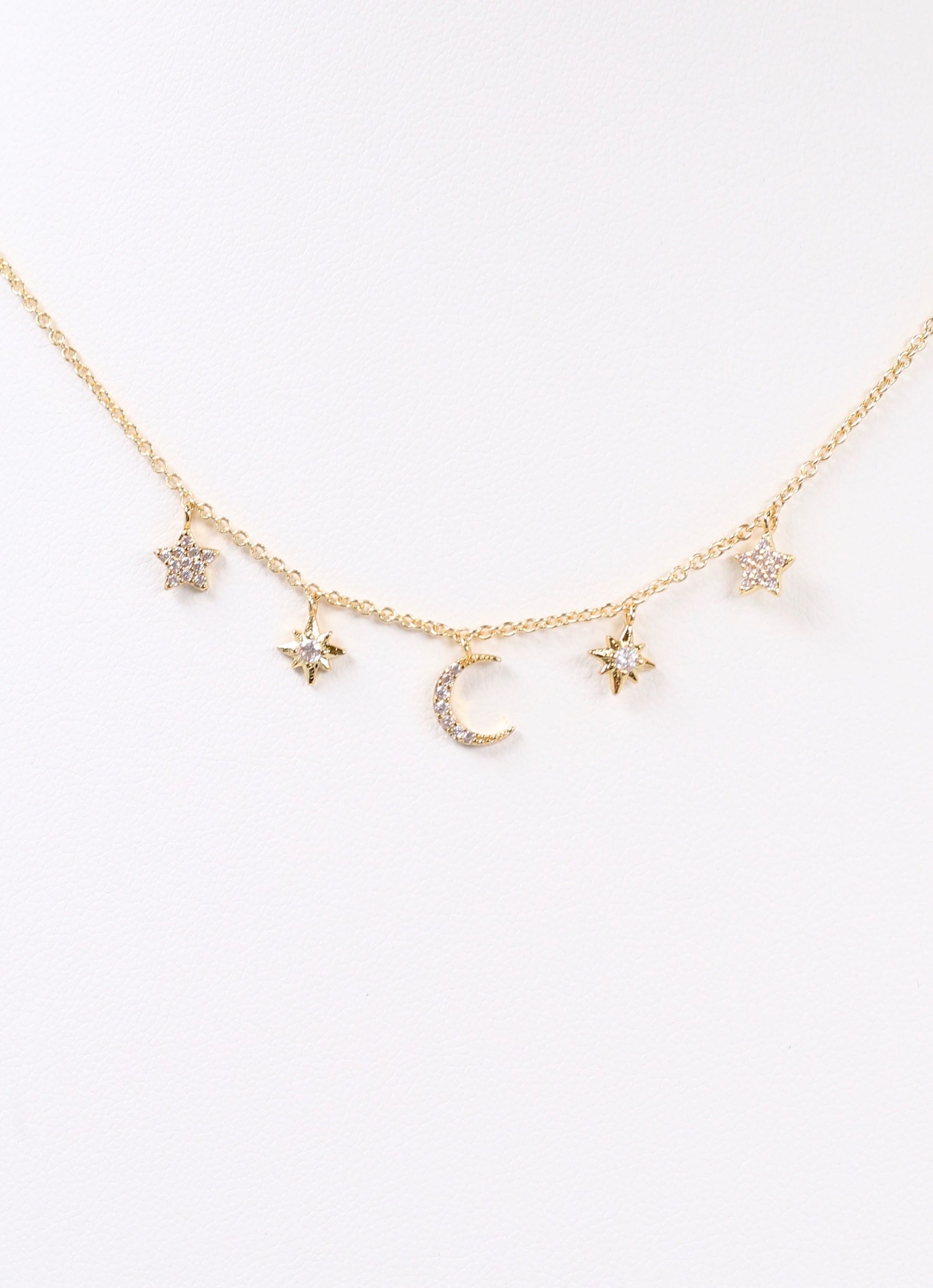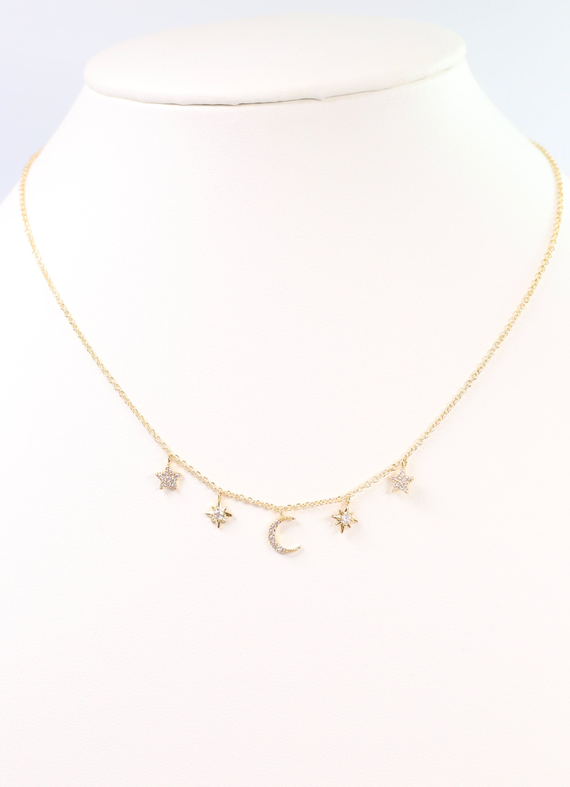 This dainty necklace features petite CZ galaxy themed charms. It has one moon and four star accents that are the perfect little size.