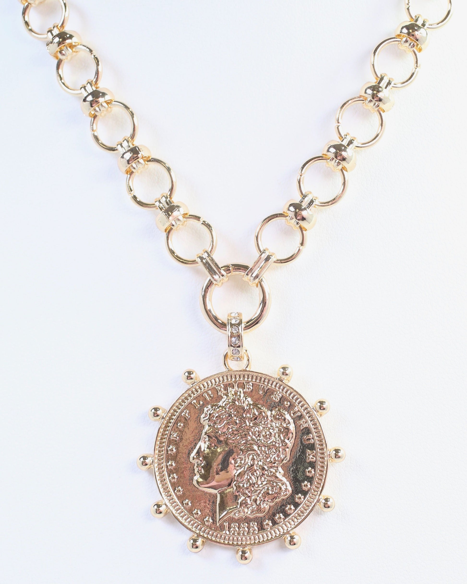 The Chandra Coin Charm Necklace in Gold features bold, shiny round chain links paired with a large, eye-catching coin pendant edged with delicate dots. This chunky coin charm- statement piece seamlessly blends modern style with classic charm, perfect for elevating any outfit with a fashionable edge.