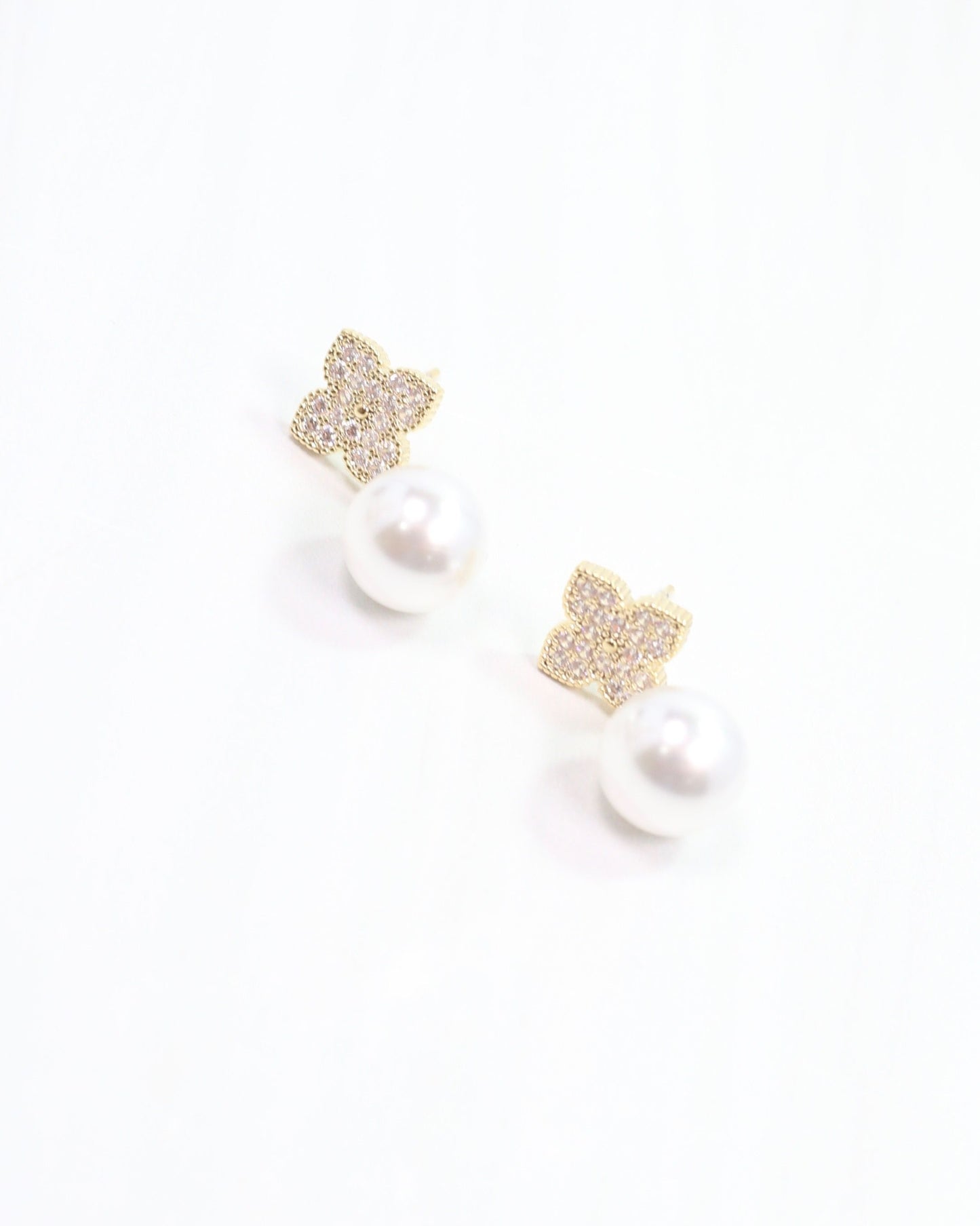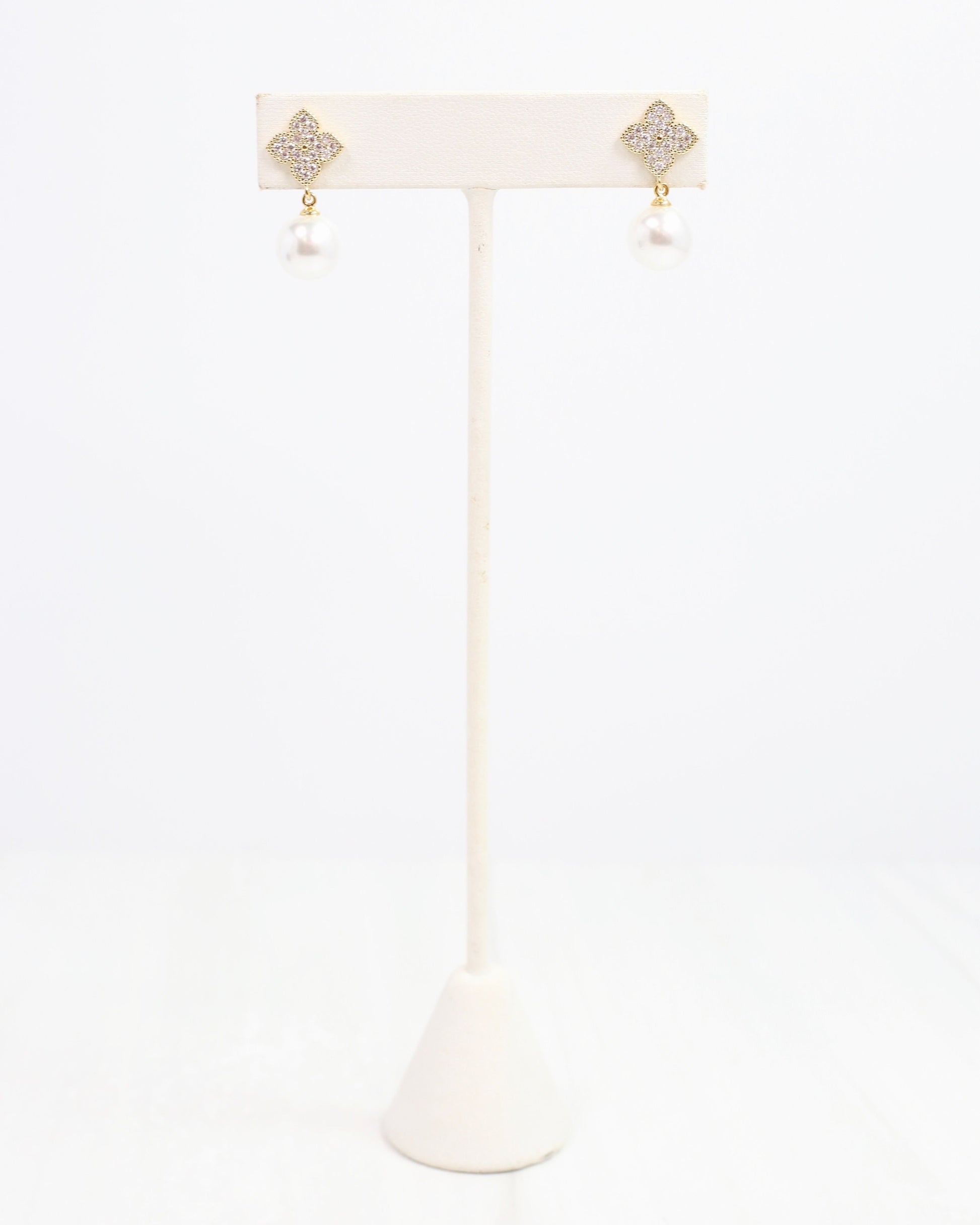 Add a touch of elegance to your look with our Pave Clover and Pearl Drop Earrings! Featuring a delicate clover at the post and a dangling pearl, these earrings make a classic statement. Subtle yet elegant, they are the perfect accessory for any occasion.