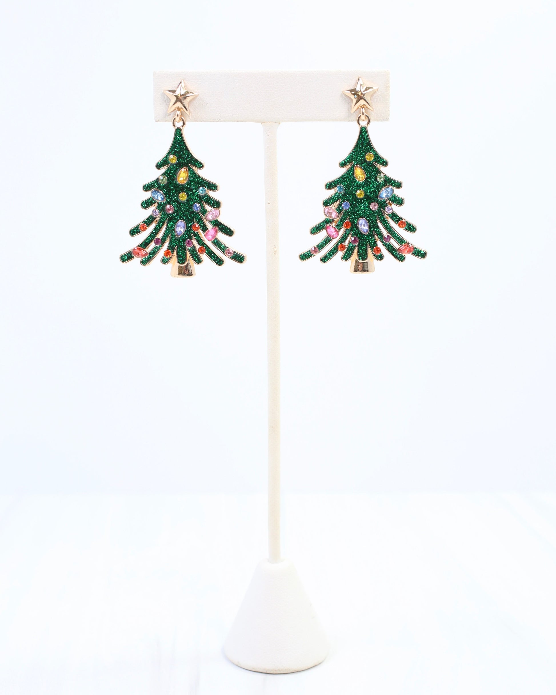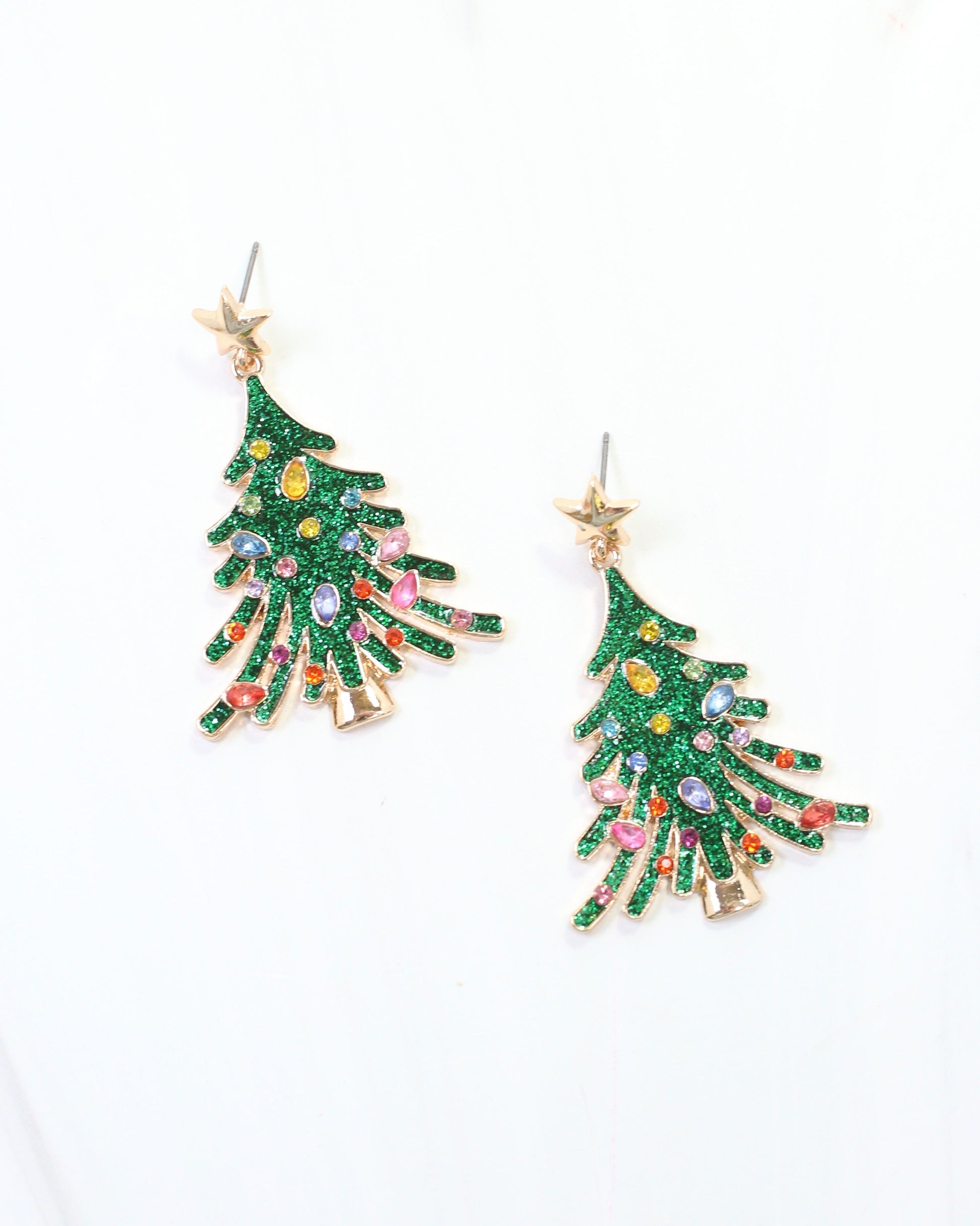 Add a touch of holiday glamour with these Christmas Sparkle Tree Earrings in green glittered enamel. Adorned with multi-colored, uniquely shaped crystal stones, each earring is crowned with a gold star post for a chic, festive look. Perfect for making your holiday style shimmer.