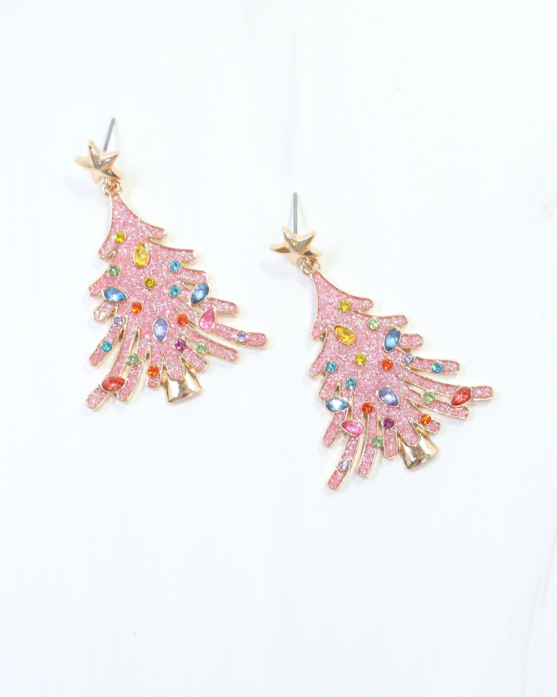 Add a touch of holiday glamour with these Christmas Sparkle Tree Earrings in pink glittered enamel. Adorned with multi-colored, uniquely shaped crystal stones, each earring is crowned with a gold star post for a chic, festive look. Perfect for making your holiday style shimmer.