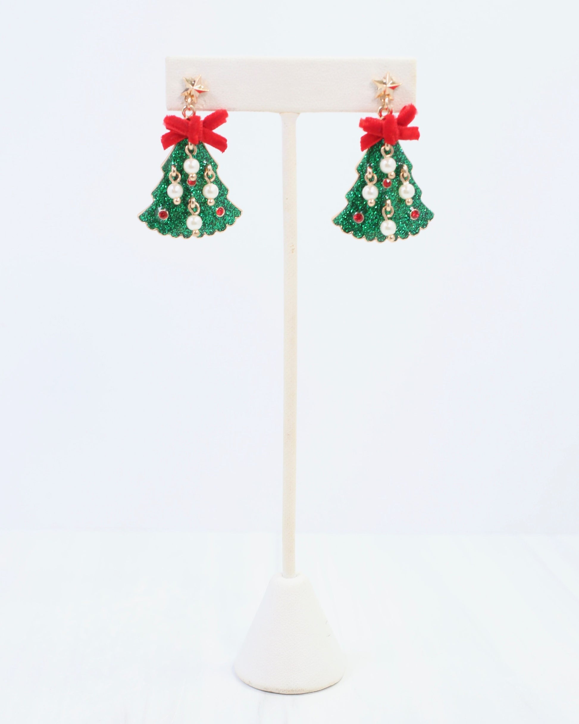 Celebrate the season with these fashionable Christmas Tree Earrings in green enamel. Featuring sparkling red crystal stones, elegant dangling pearls, and a plush velvet bow, each earring is topped with a charming star post for a festive finish. Perfect for adding a touch of holiday sparkle to any outfit.